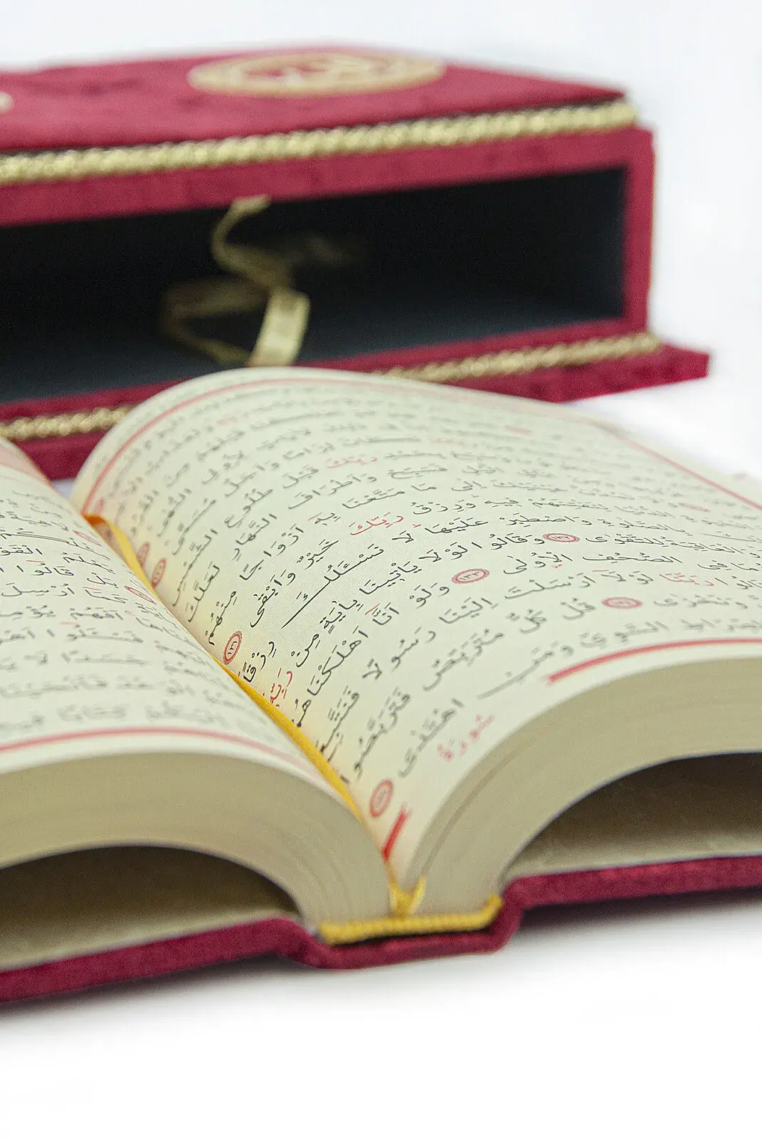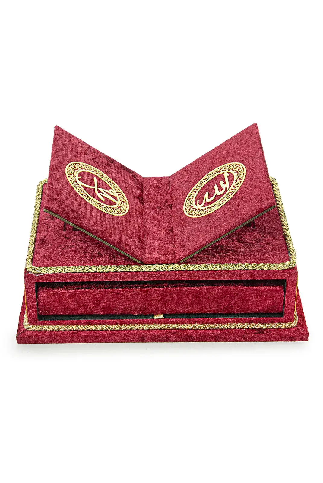 The chest and the Quran are covered with the same color velvet fabric and decorated with Islamic, Ottoman, Arabic Basmala and the Word of Allah.