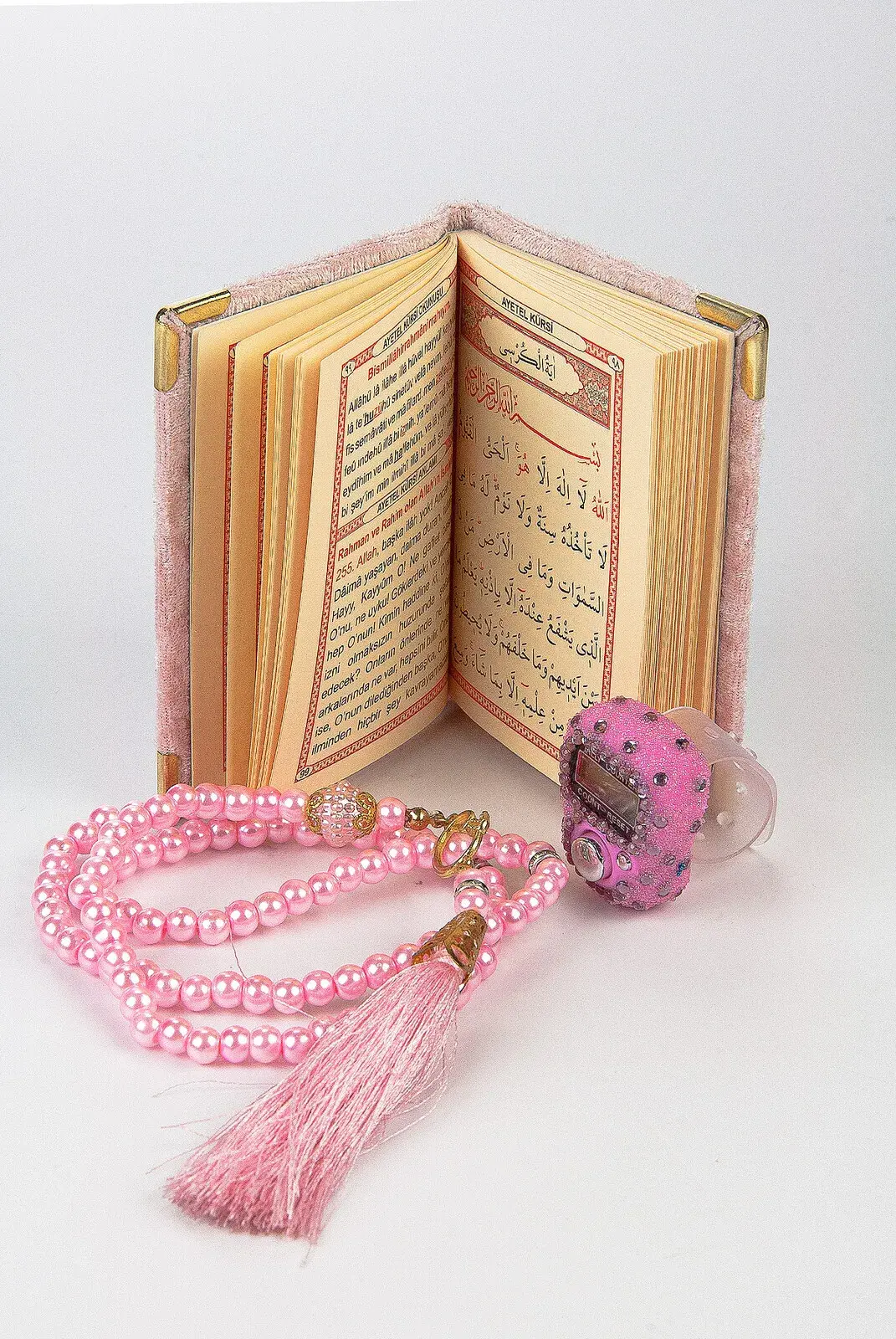 Taşlı Zikirmatik - Mini Kadife Yasin - İnci Tesbihli Hediyelik Set - Pembe Renk