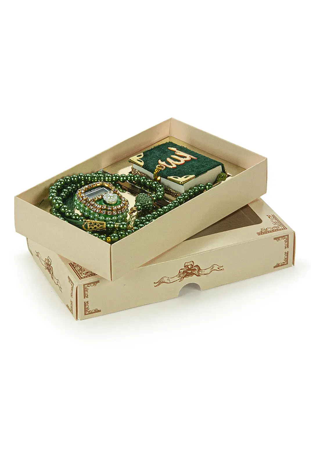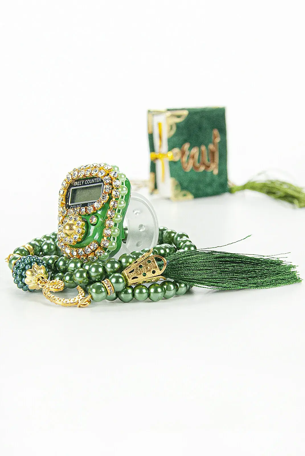 Taşlı Zikirmatik ve İnci Tesbihli Mini Kadife Kuranı Kerim Seti Mevlüt Hediyesi - Yeşil
