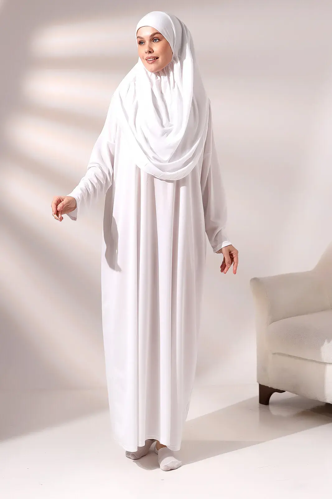Ürün başörtüsüyle tek parçadan oluşur, pratik ve kolay giyilir.