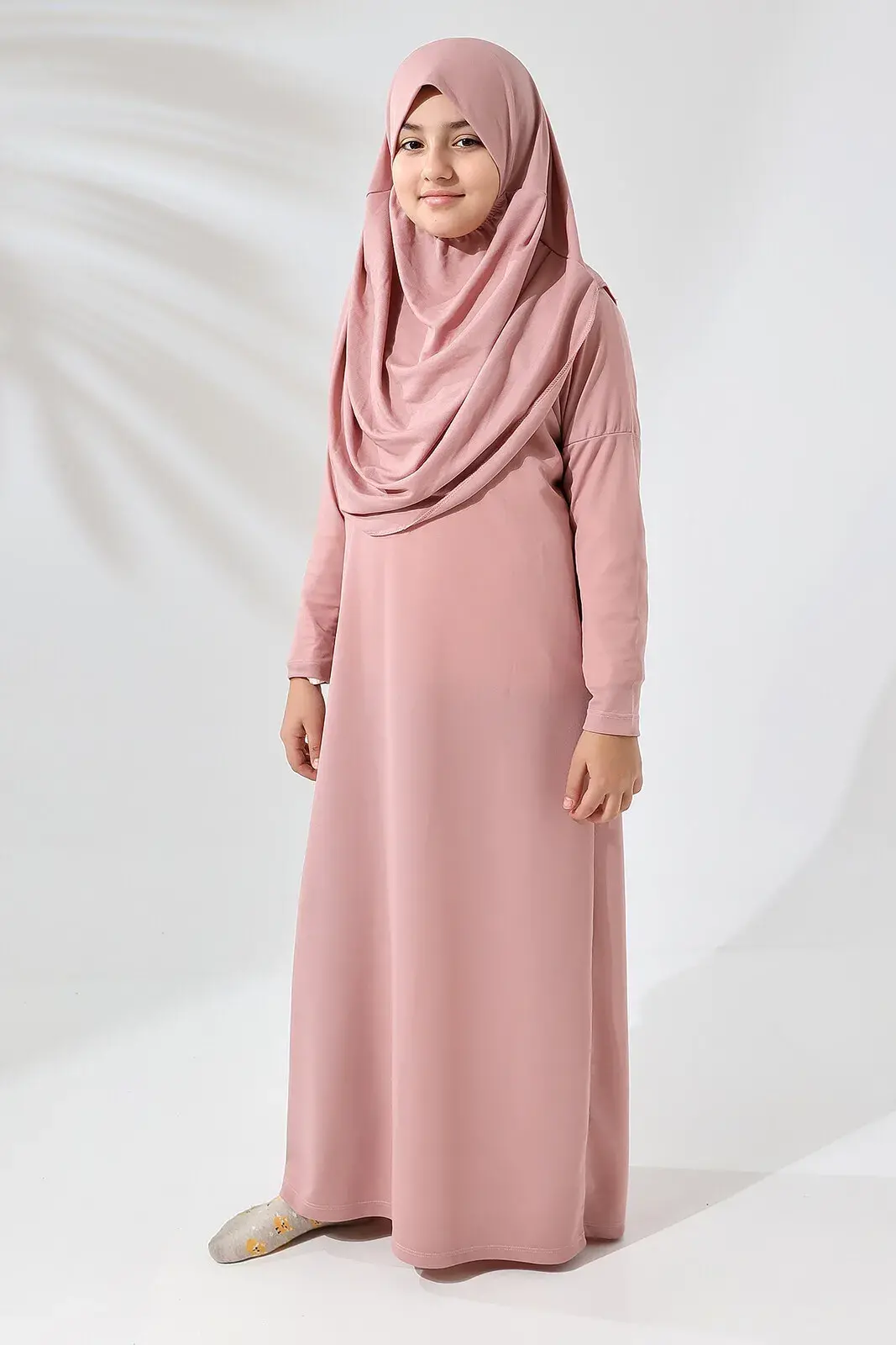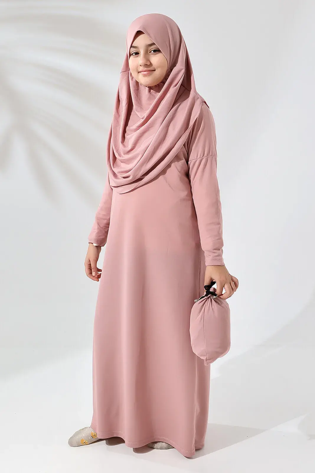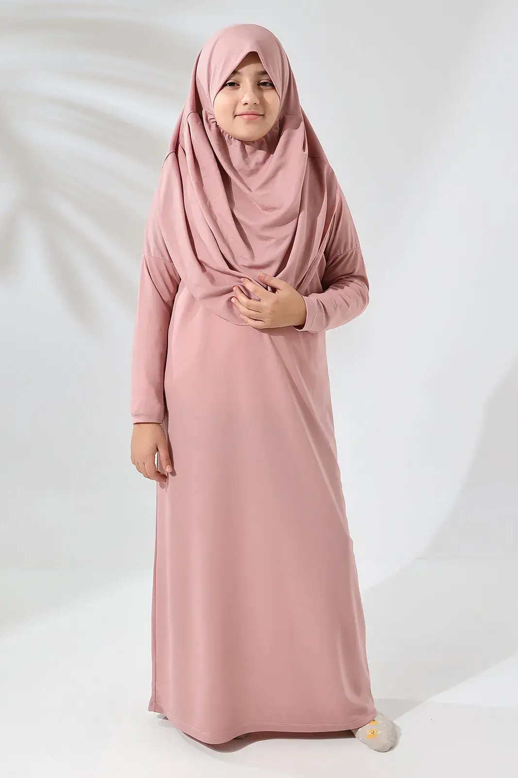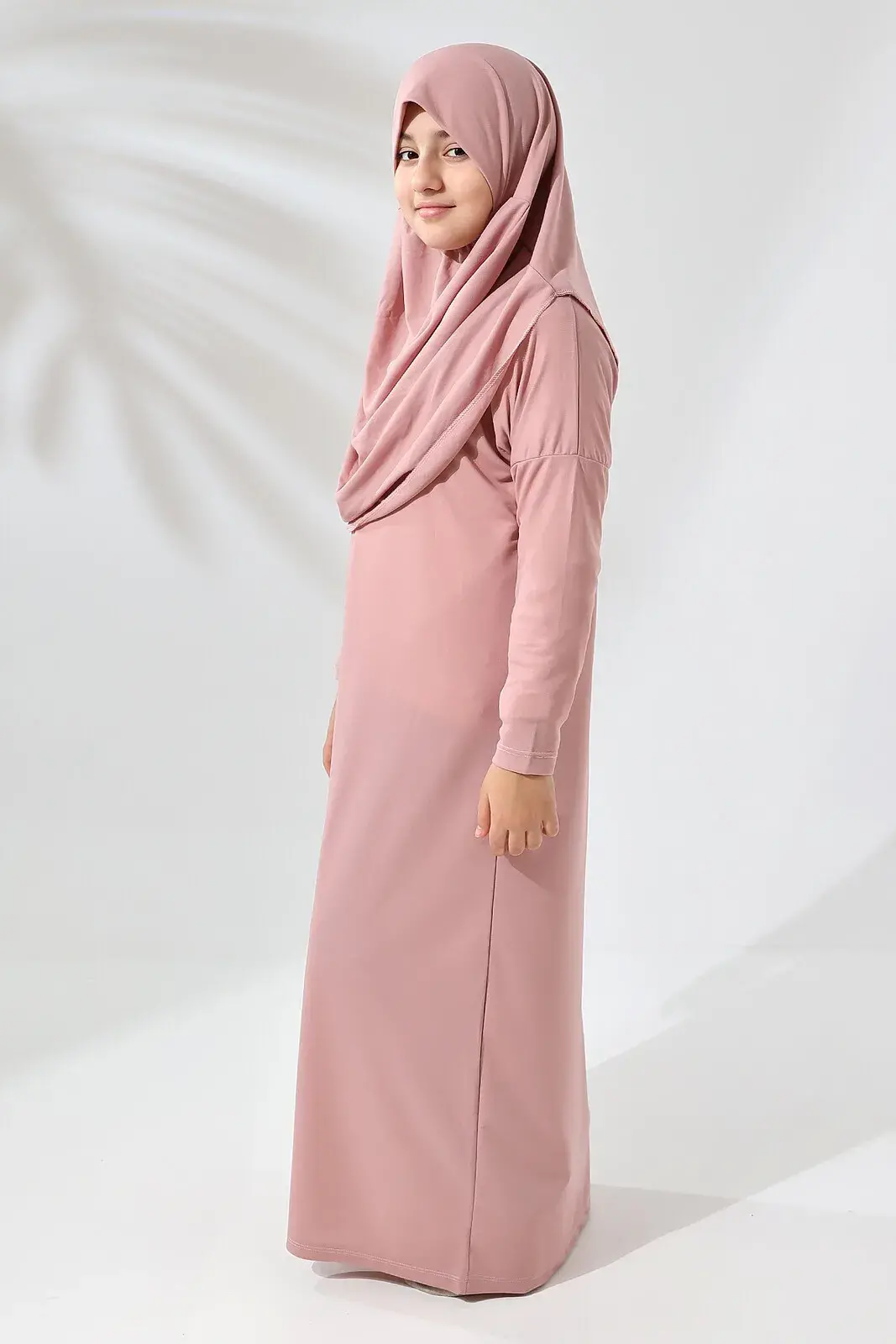 Tek Parça Pratik Başörtülü Çocuk Namaz Elbisesi Gül Kurusu