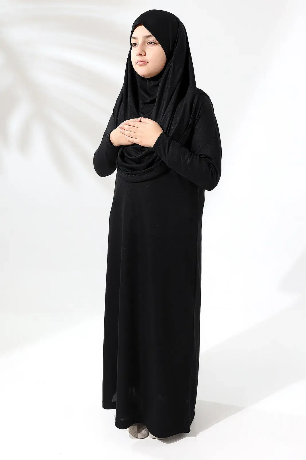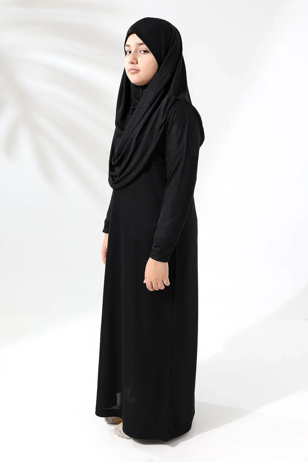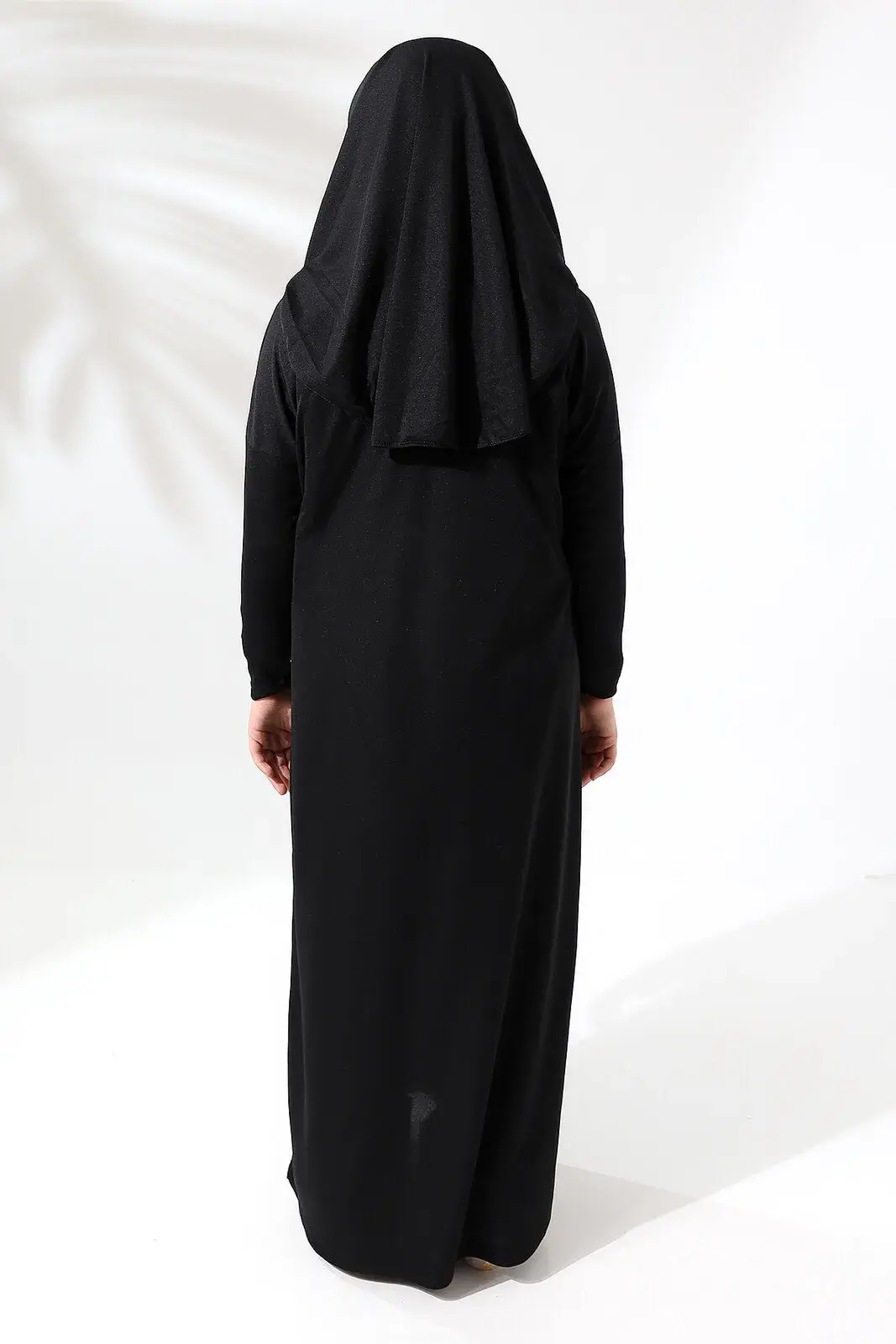 Tek Parça Pratik Başörtülü Çocuk Namaz Elbisesi Siyah