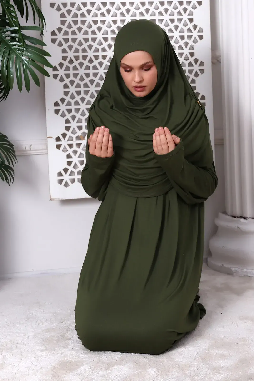 Tek Parça Pratik Başörtülü Robalı Namaz Elbisesi 8015 Haki