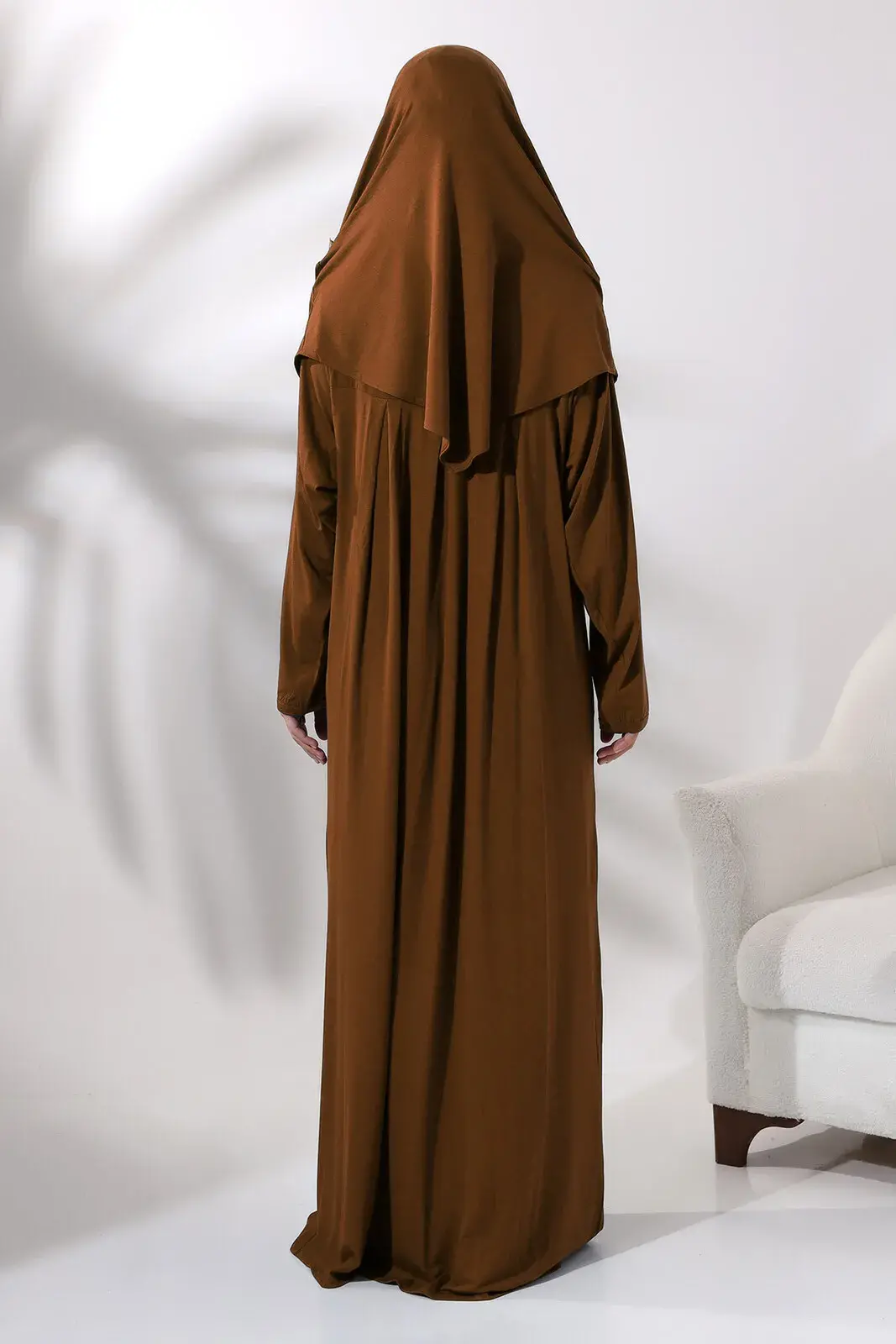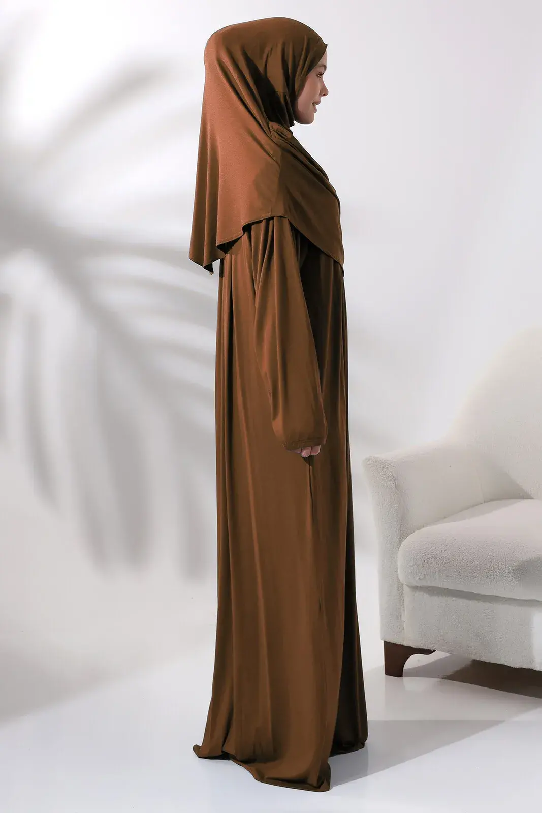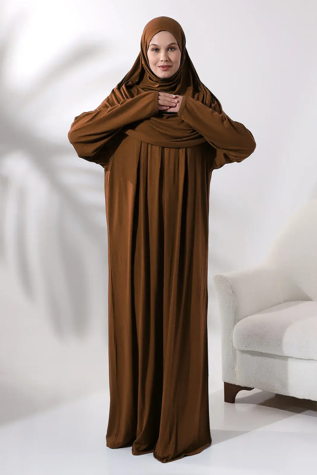 Ürün başörtüsüyle tek parçadan oluşur, pratik ve kolay giyilir.