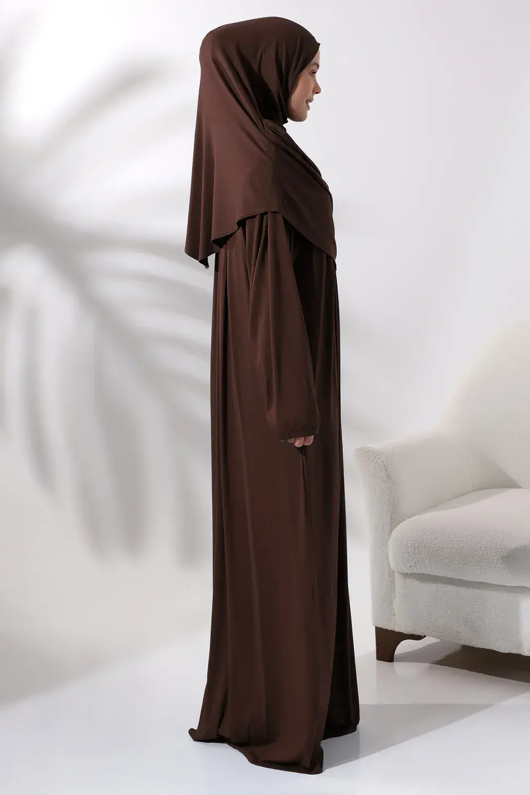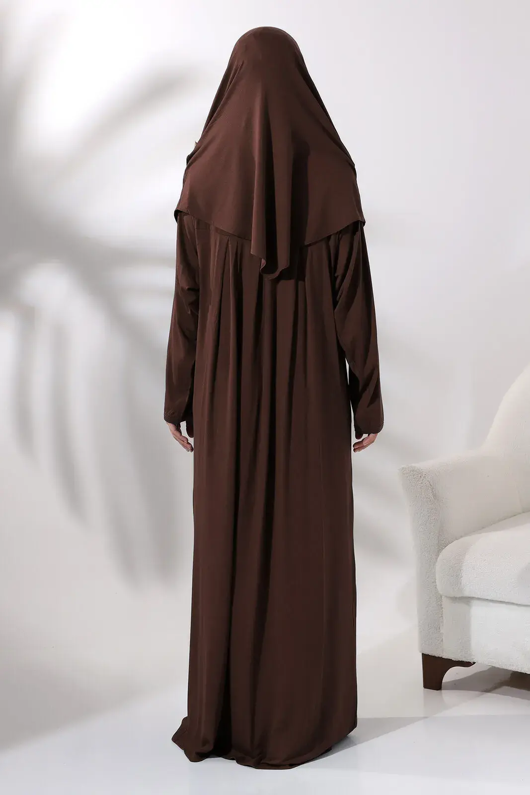 Ürün başörtüsüyle tek parçadan oluşur, pratik ve kolay giyilir.