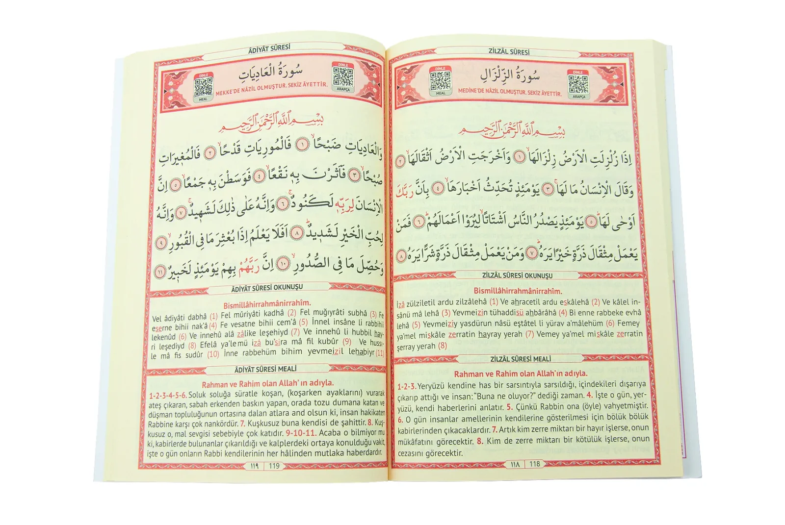 • Arapça metin + Türkçe okunuş + Türkçe meal birlikte