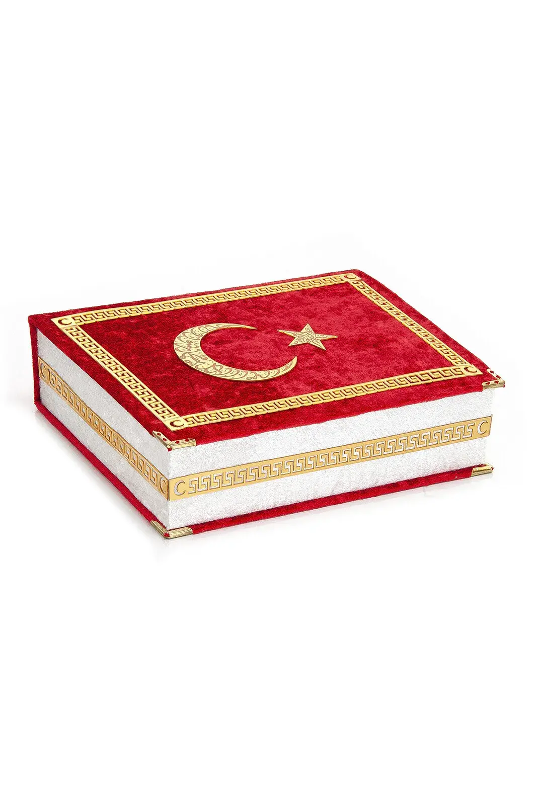 The box and the Quran are covered with the same color velvet fabric and decorated with Turkish flag motifs.