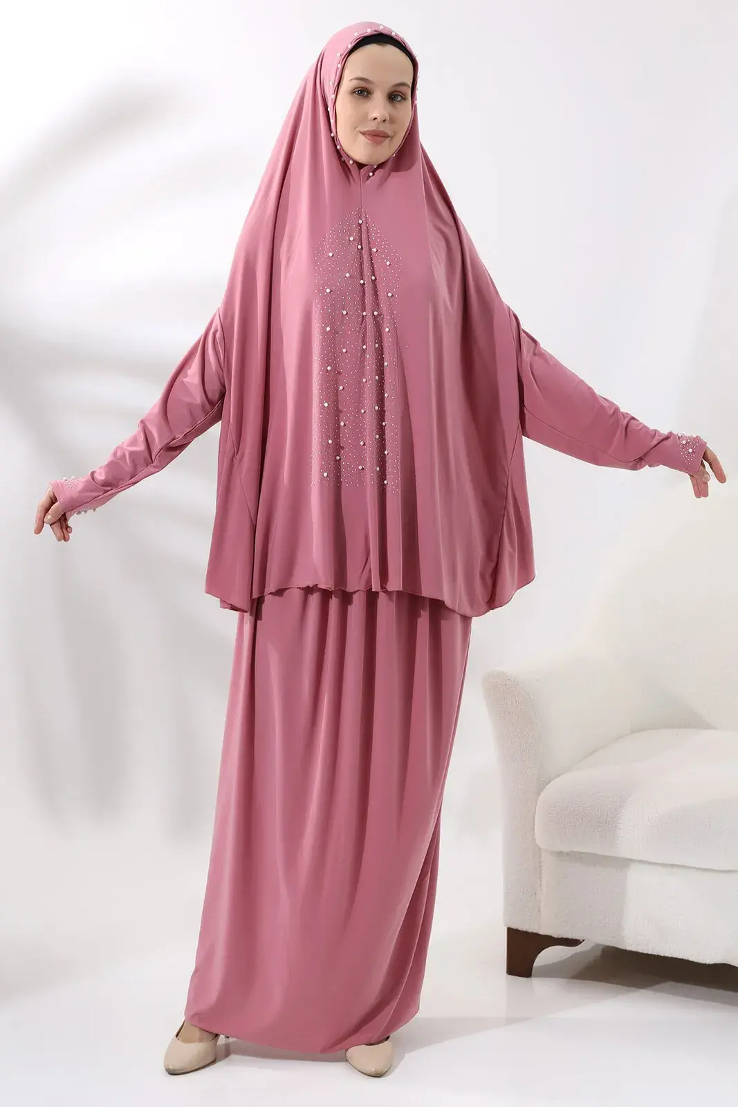 Two Piece Prayer Dress with Pearls and Stones, Top and Bottom Practical Dress 8017 Pink