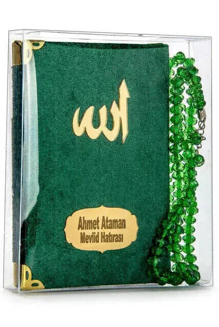 Velvet Coated Yasin Book - Cep Boy - Name Special Plate - Rosary - Boxed - Green - Mevlut Gift