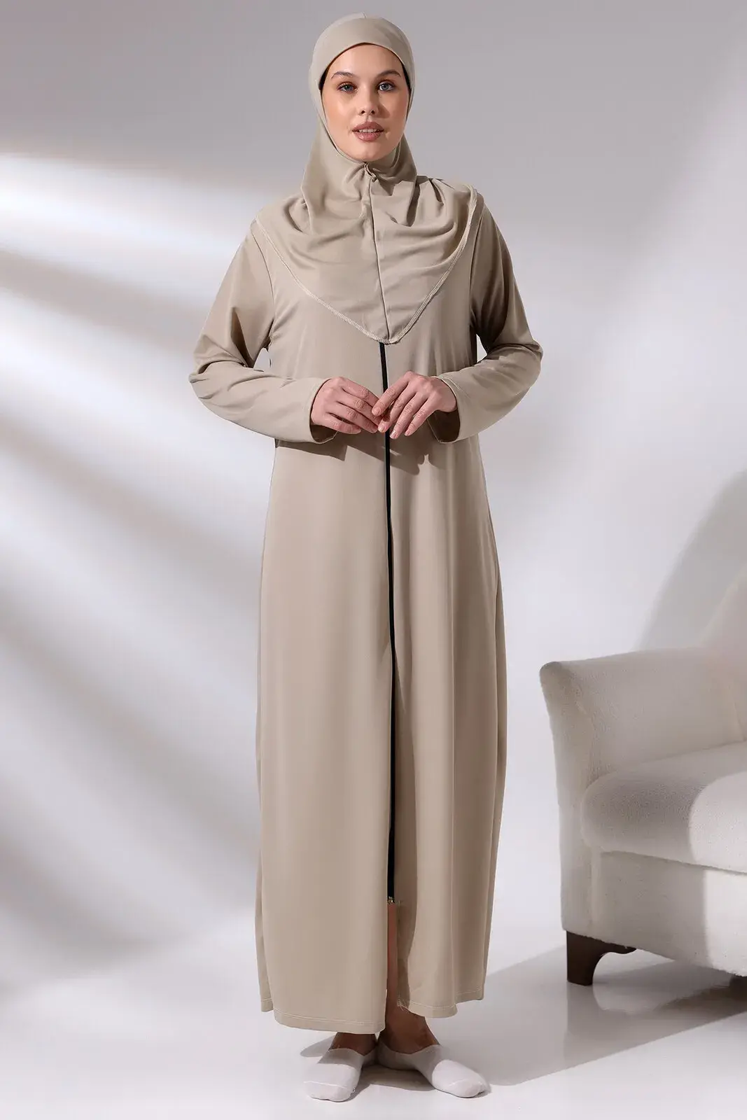 Bu özel tasarım, polyester kumaştan üretilmiş olup, başörtüsü ile tek parça halindedir, böylece rahatça namaz kılabileceğiniz bir ortam oluşturur. Fermuarlı yapısı sayesinde, giyip çıkarmak son derece pratik ve kolaydır. Bu özel namaz elbisesi, namaz vakti geldiğinde hızlı ve pratik bir şekilde ibadet için hazır olmanızı sağlar.