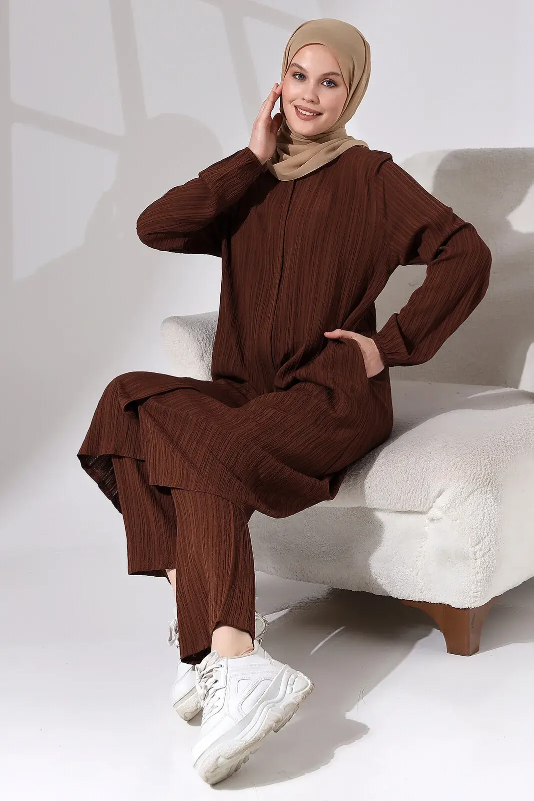 Women's Wrapped Fabric Hidden Zipper Double Set Hajj Umrah Outfit Brown