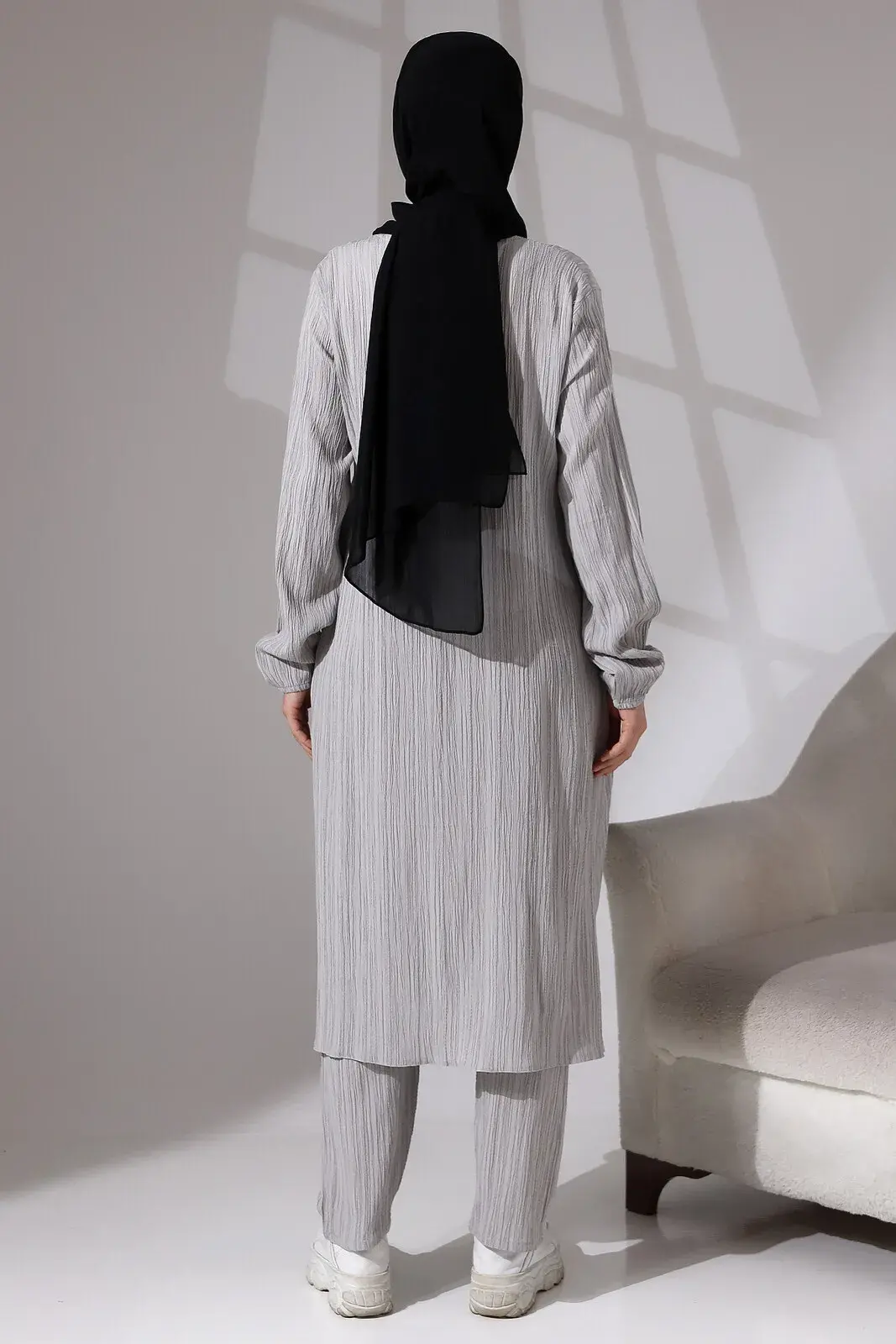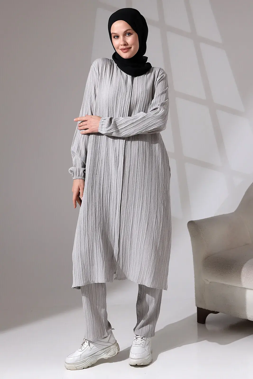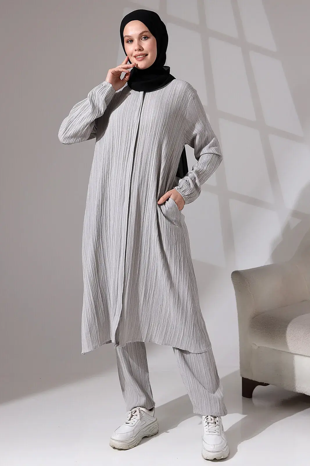 Our product is knitted fabric and has a round neck and a hidden zipper. The wrist part is elasticated and has a pocket detail. Its height is suitable for Hajj and Umrah visits. The waist of the trousers is elastic. Our suit, which has breathable fabric, provides you with comfortable use during your Hajj and Umrah visits. Preferably suitable for daily use.