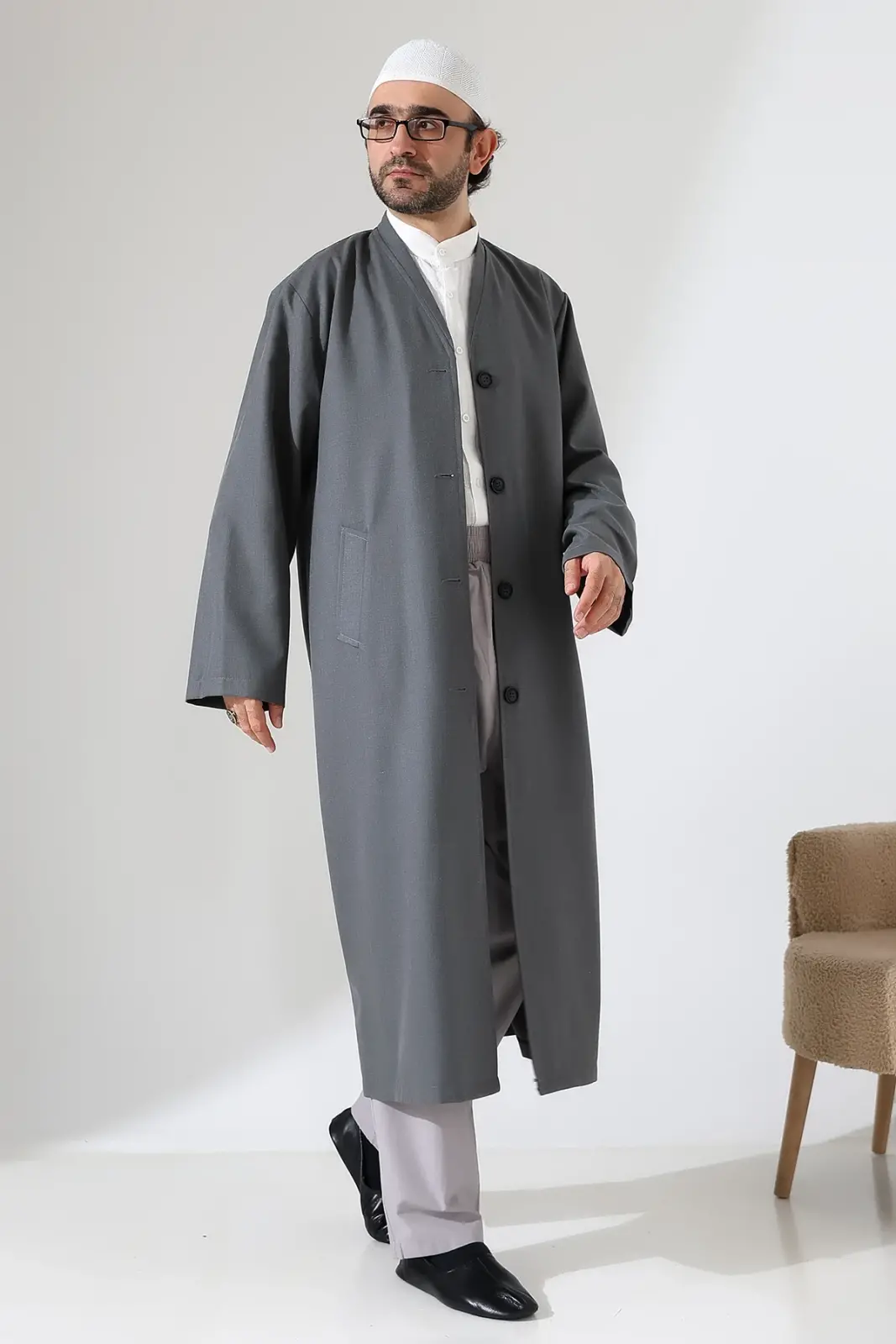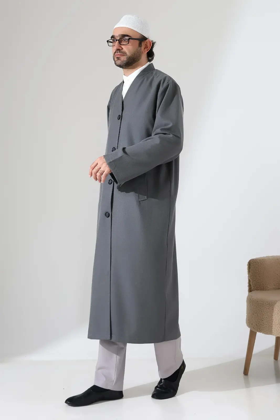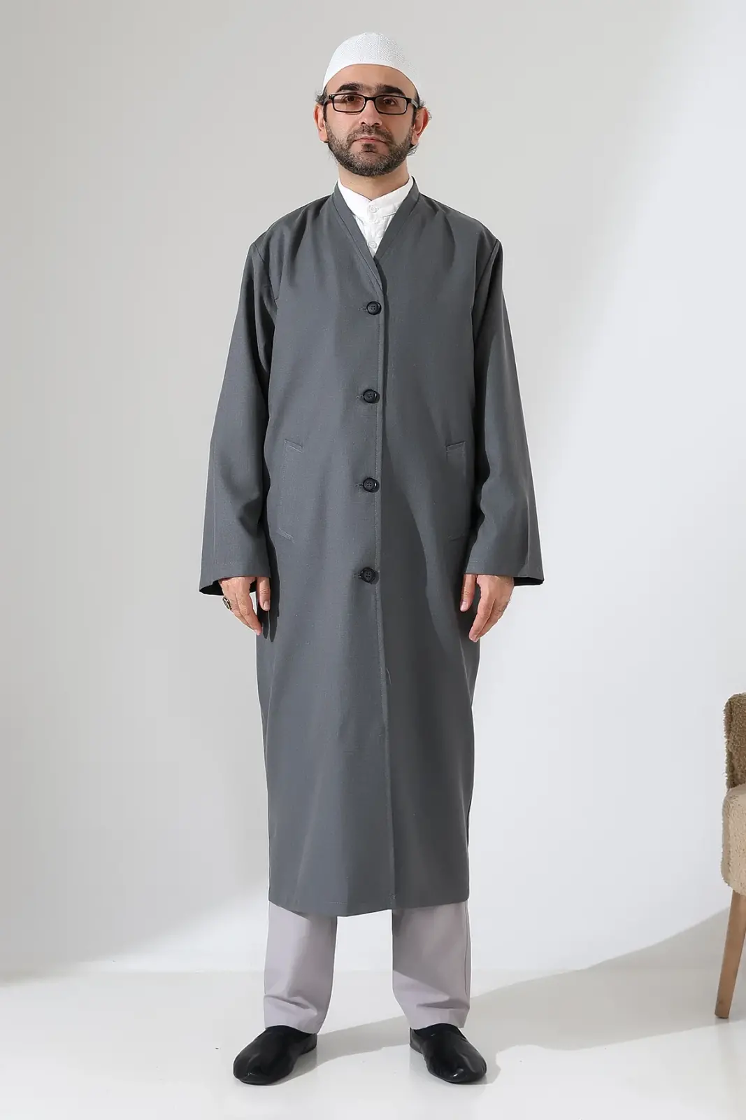 Yarım Astarlı Düğmeli Cepli Buhara Yaka Erkek Cübbe - Antrasit