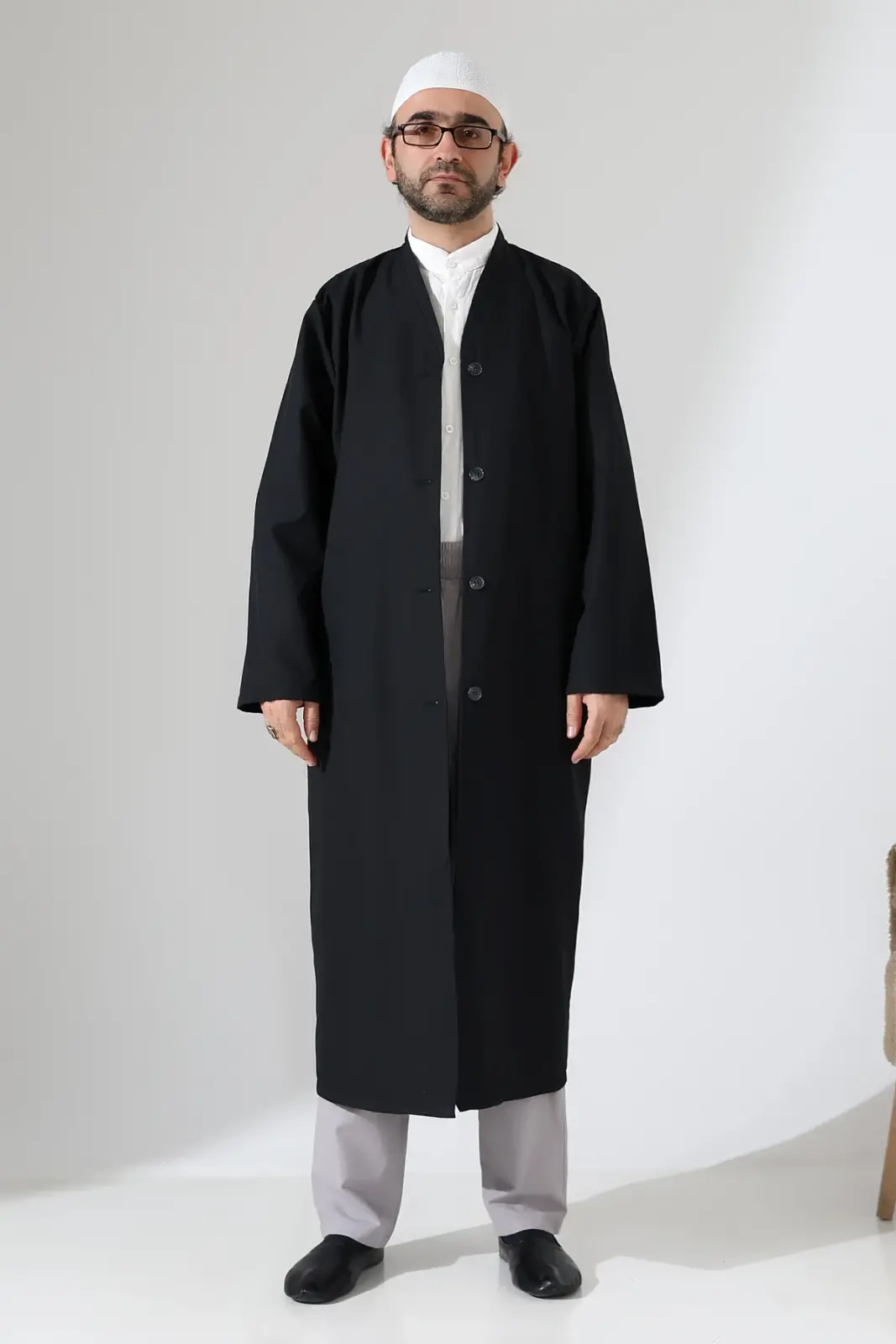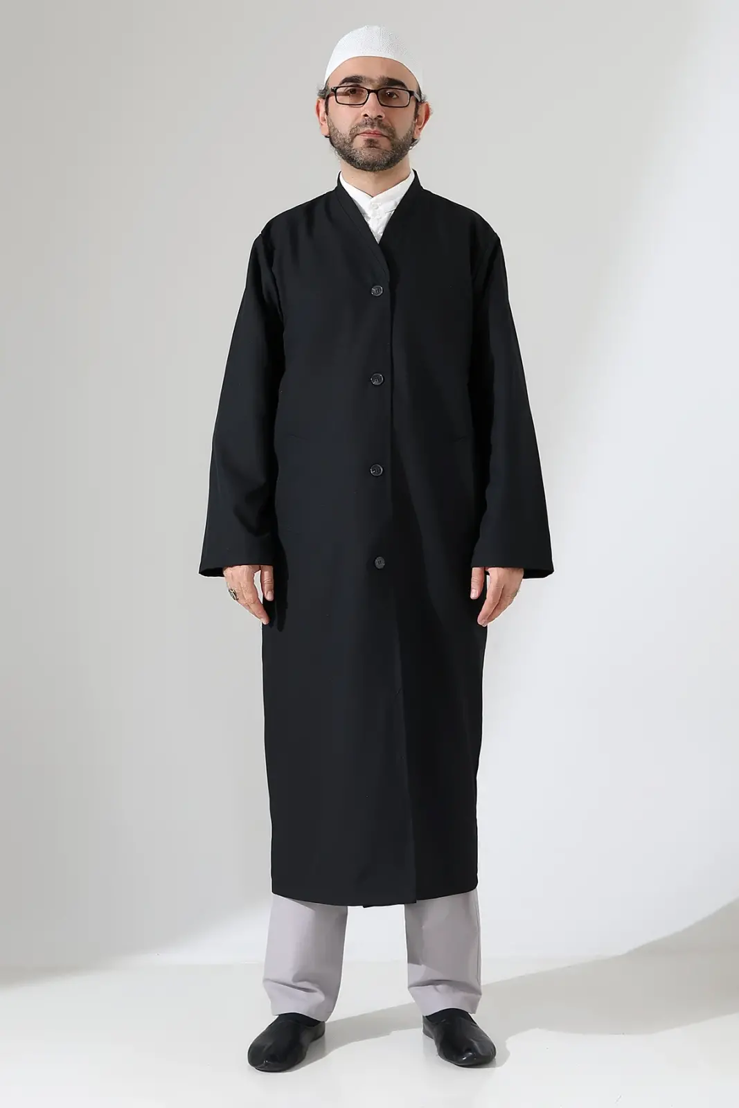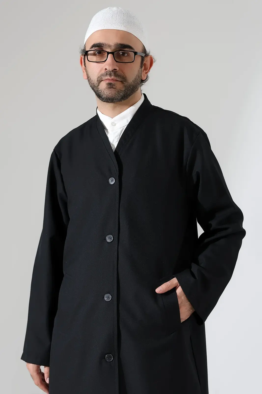 Yarım Astarlı Düğmeli Cepli Buhara Yaka Erkek Cübbe - Siyah