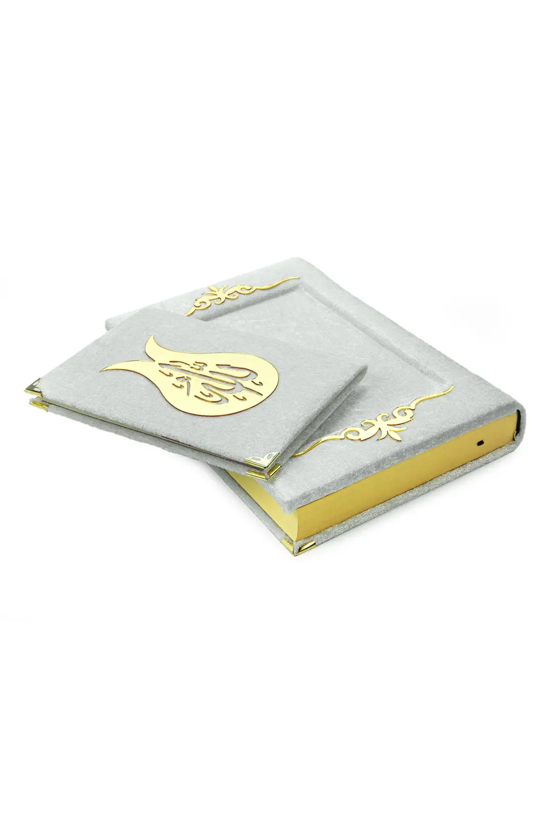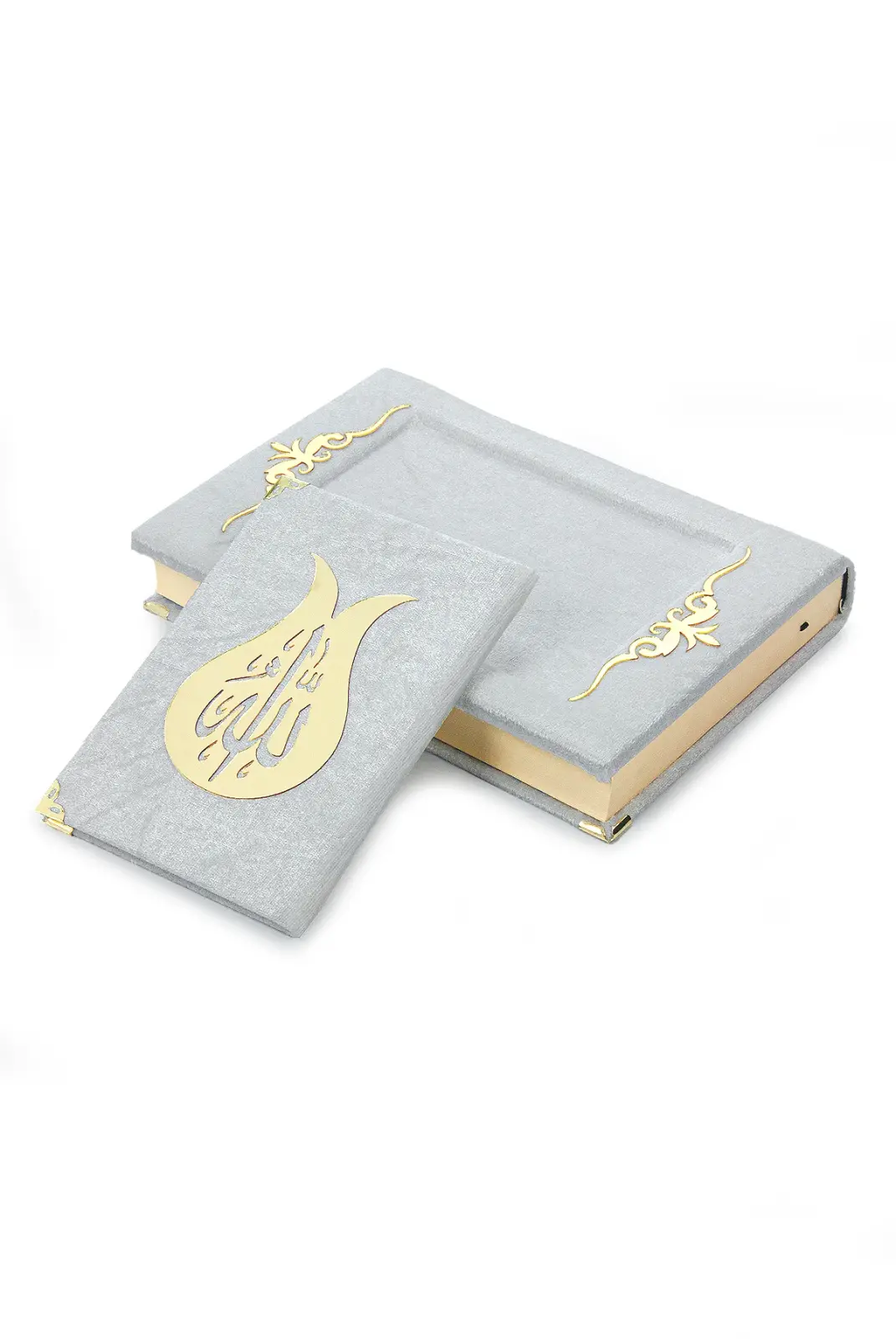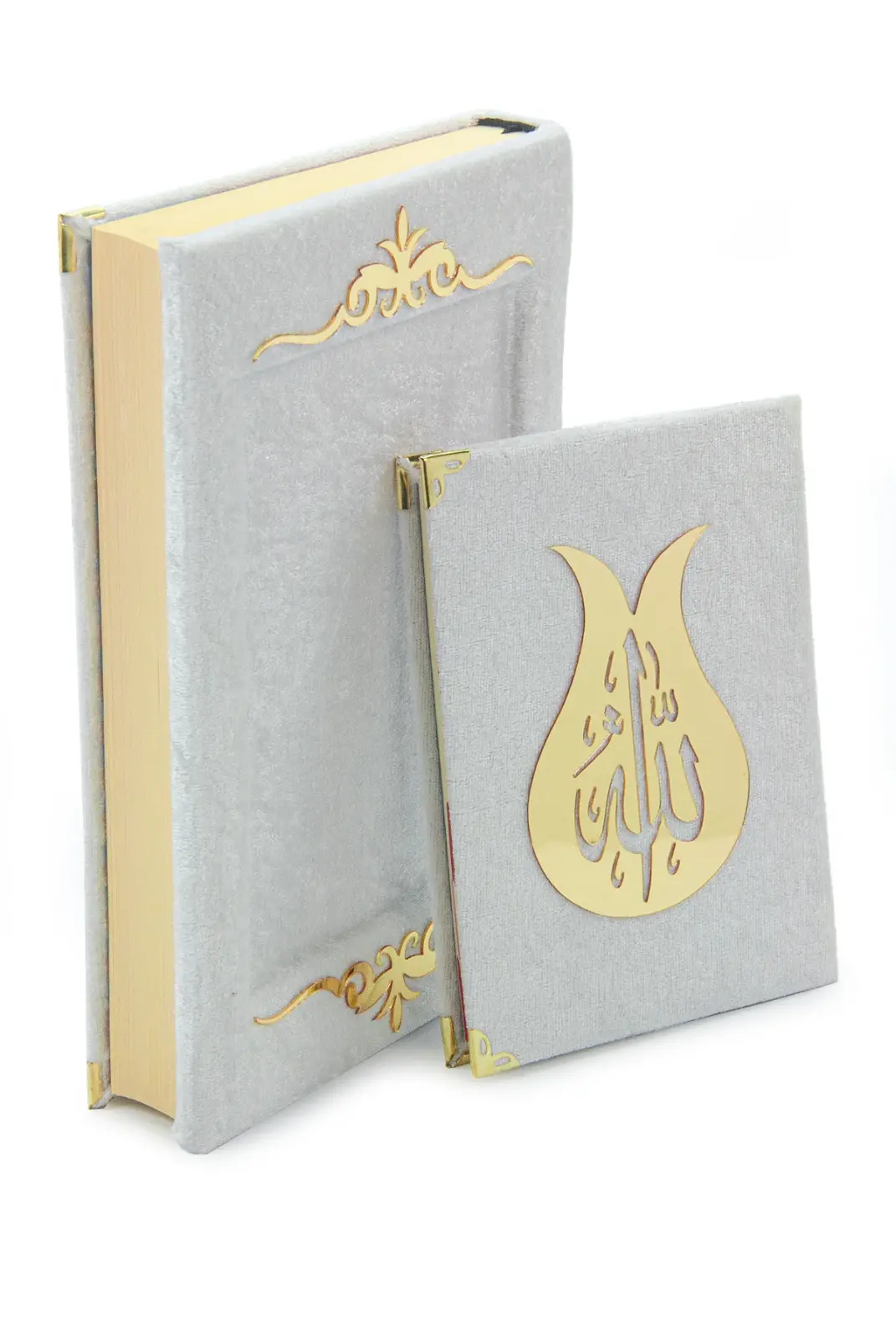 Yasinli Kadife Kaplı Kuranı Kerim Kitabı Seti - Pleksi Süslemeli, Arapça - Gri