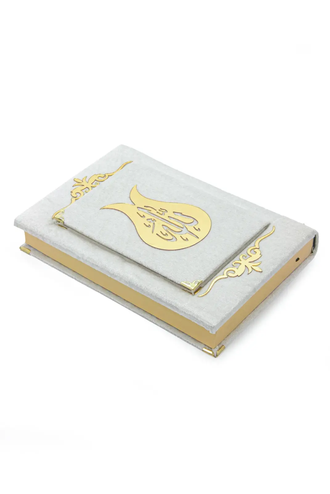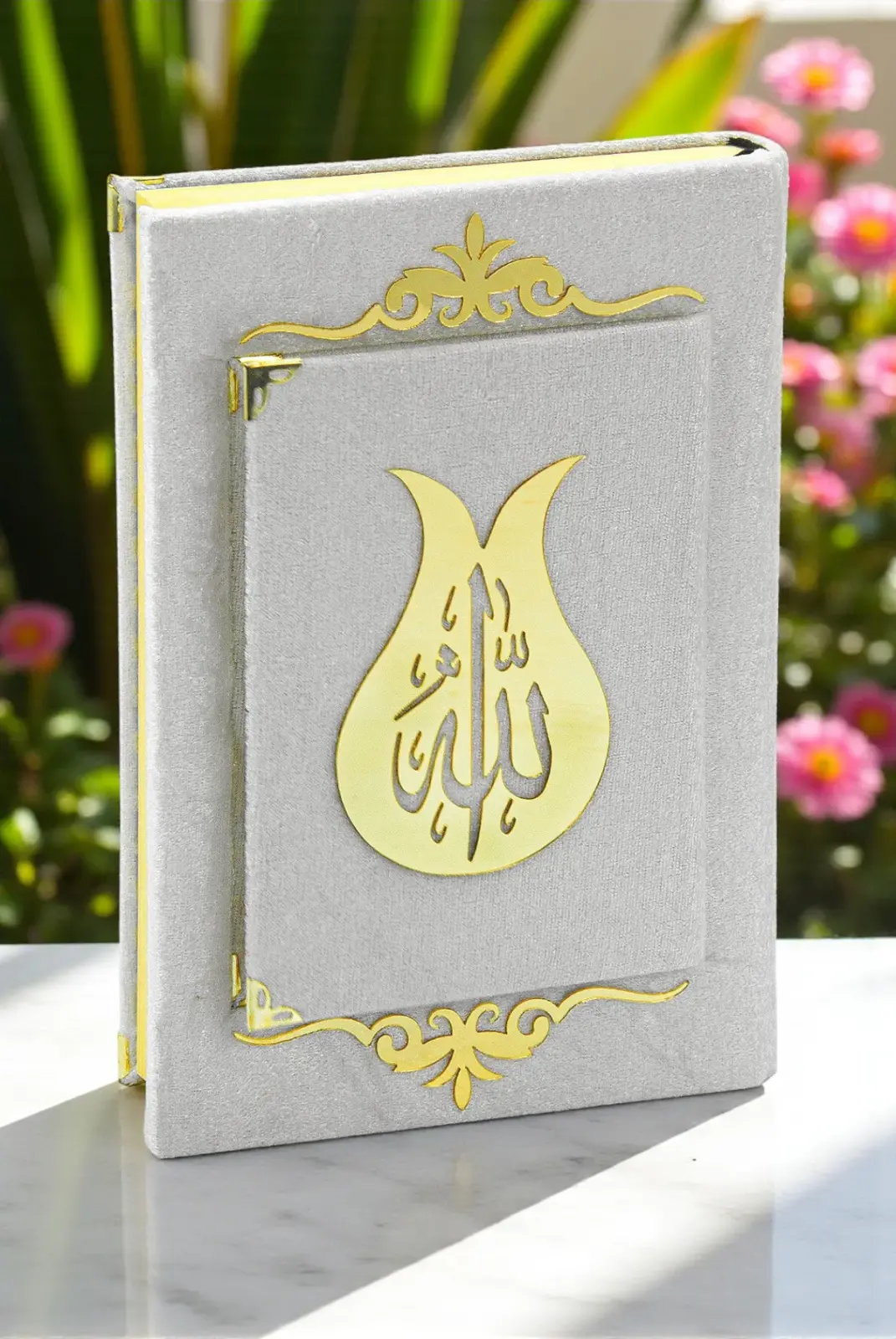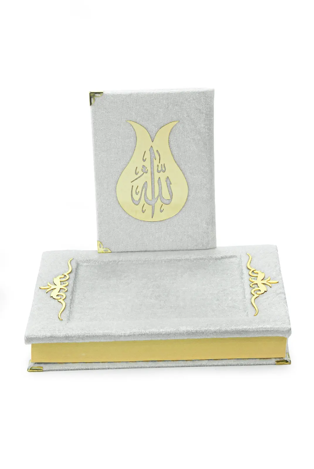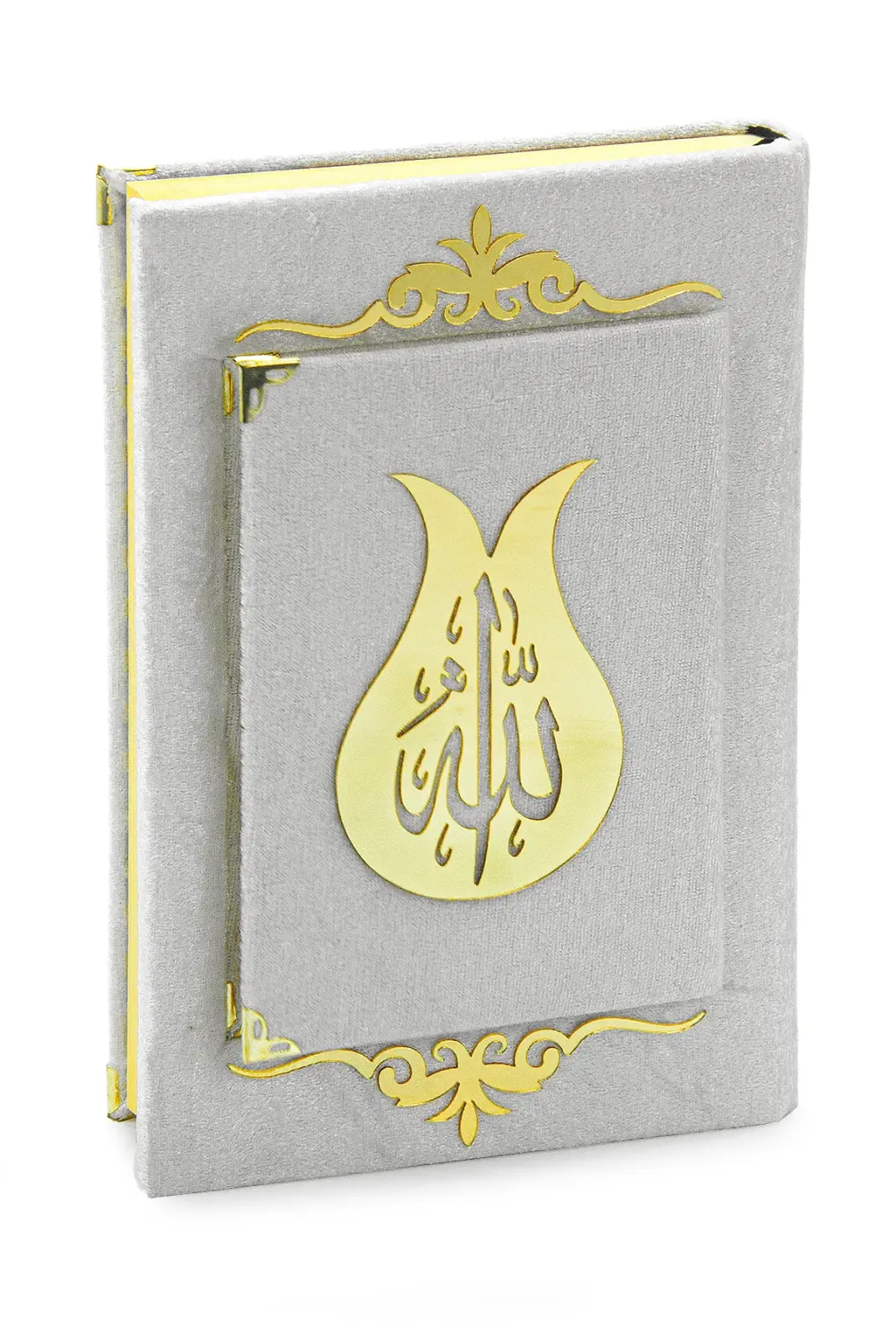 Yasinli Kadife Kaplı Kuranı Kerim Kitabı Seti - Pleksi Süslemeli, Arapça - Gri