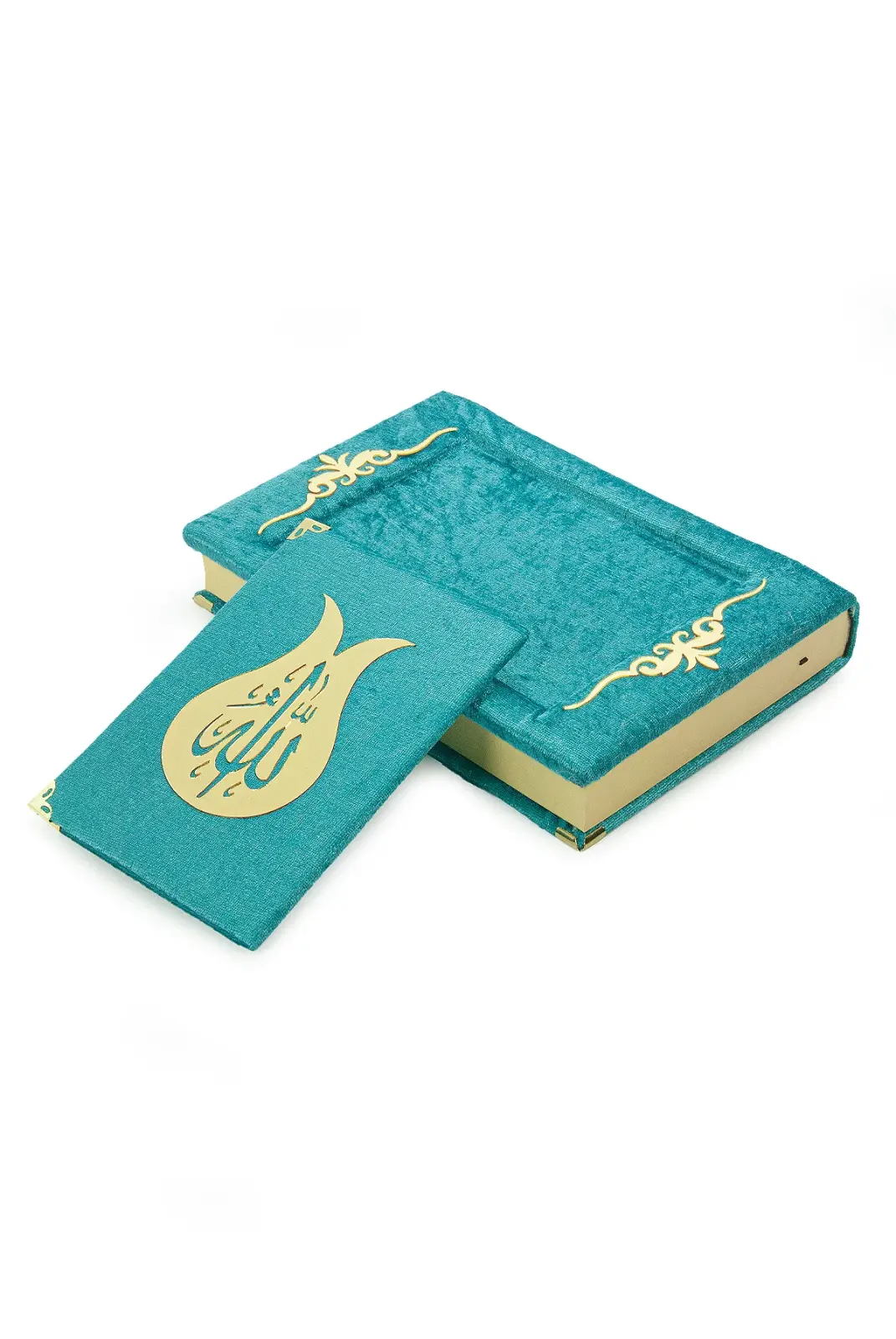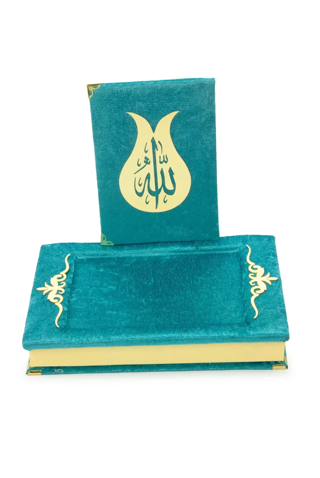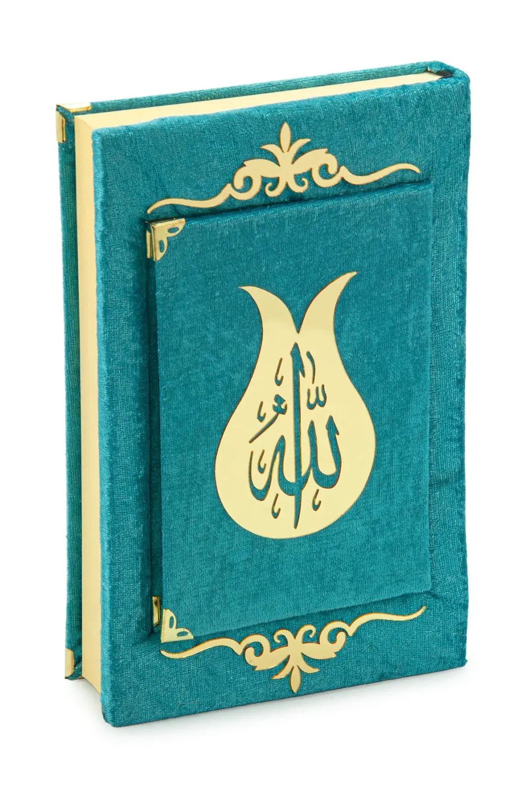 Yasinli Kadife Kaplı Kuranı Kerim Kitabı Seti - Pleksi Süslemeli, Arapça - Petrol
