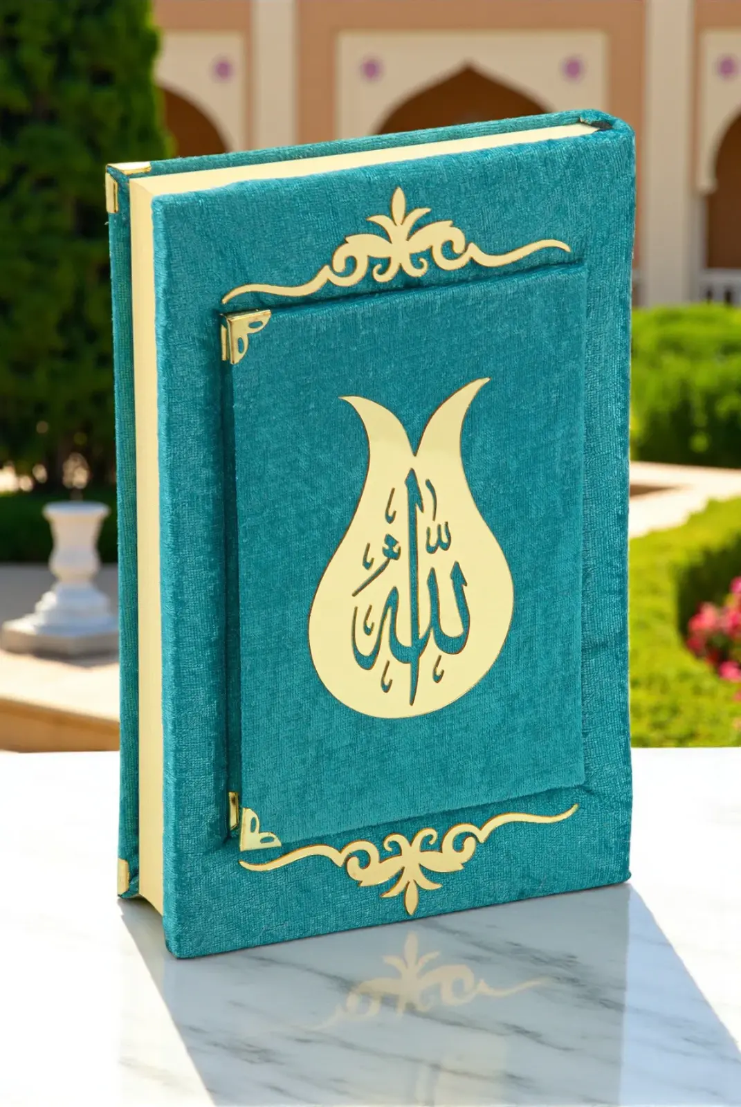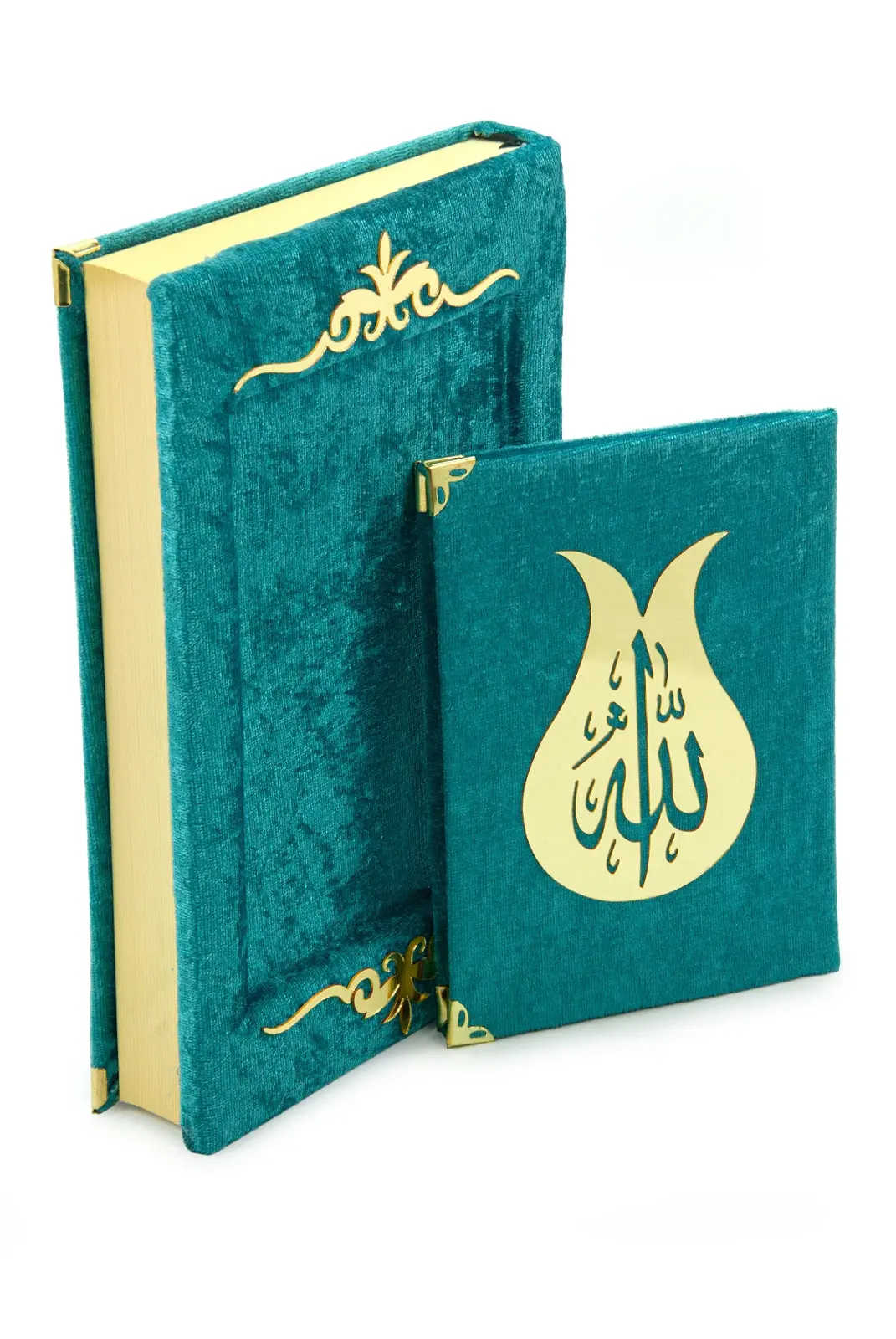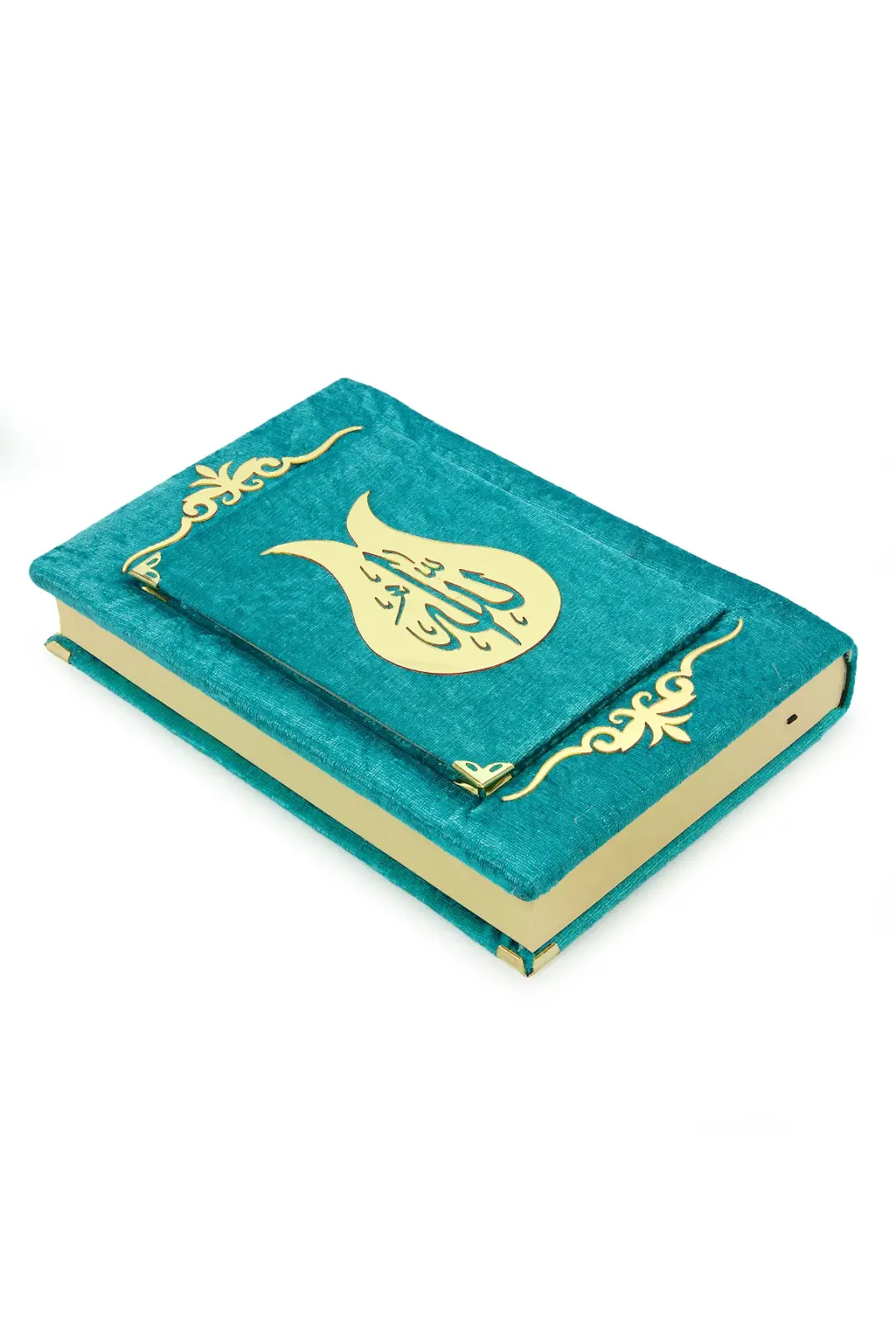 Yasinli Kadife Kaplı Kuranı Kerim Kitabı Seti - Pleksi Süslemeli, Arapça - Petrol