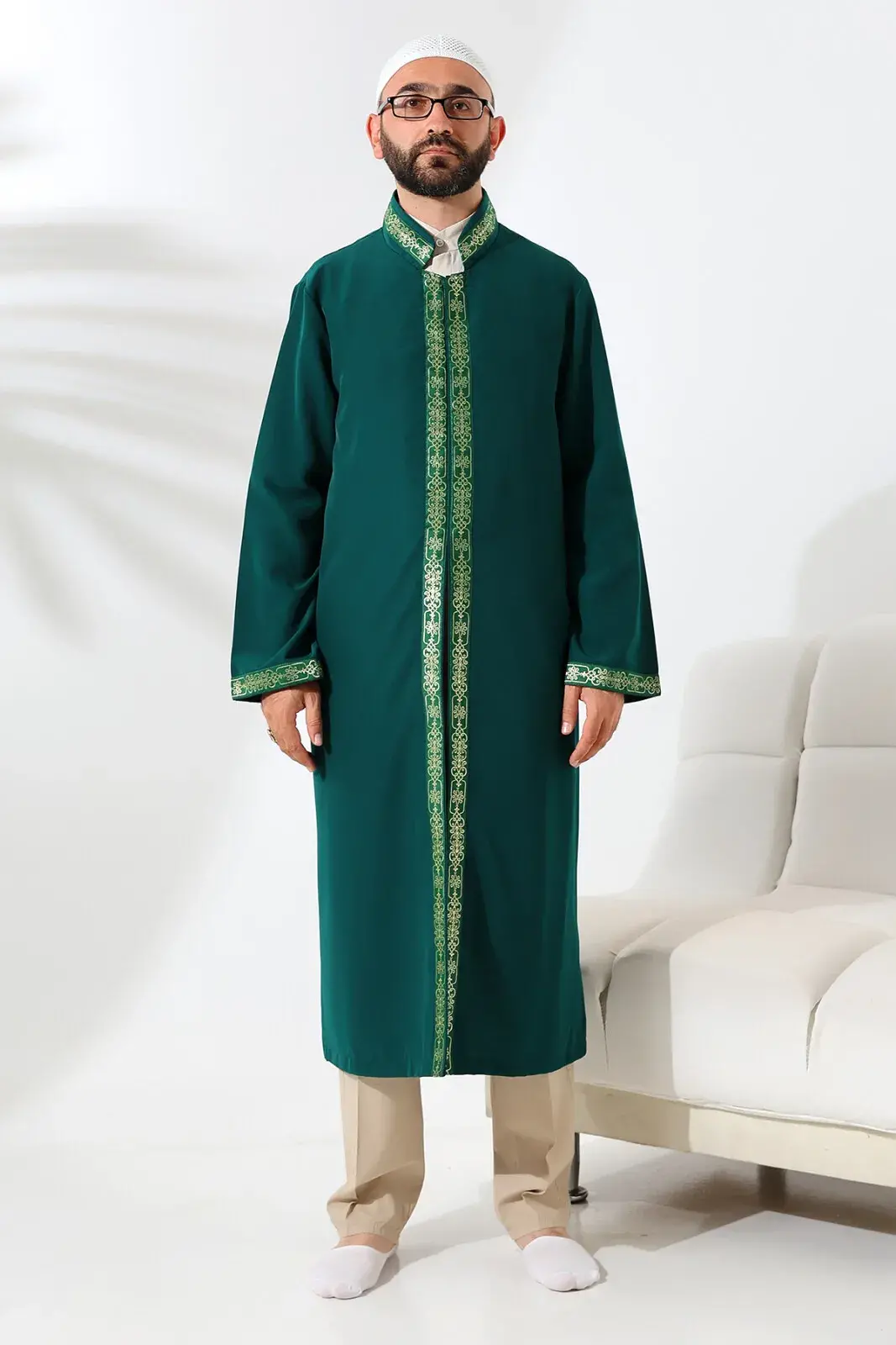 Geleneksel ve sade bir zarafetin birleşimi olan bu İmam Cübbesi, Alpaka pamuklu kumaşı sayesinde ibadet sırasında rahatlık sağlarken, önden kapatmalı gizli çıtçıtlı tasarımı kullanımı kolaylaştırır. Hakim yaka detayı, cübbeye geleneksel bir hava katarak sade bir şıklık sunarken, baklava benzeri nakış işlemeler estetik bir dokunuş ekler. Bu cübbe, ibadetlerde imamların ihtiyaçlarına uygun pratik ve zarif bir seçenek sunar. Geleneksel ve işlevsel tasarımı, imamların görevlerini yerine getirirken rahatlık ve şıklığı bir araya getirir.