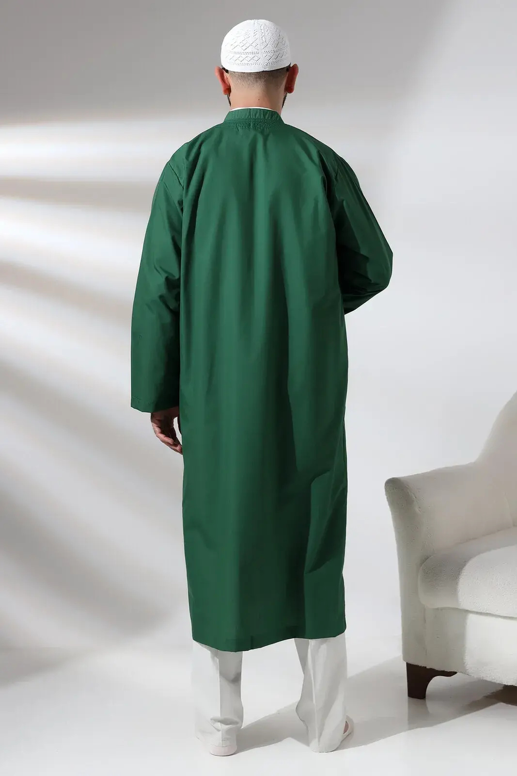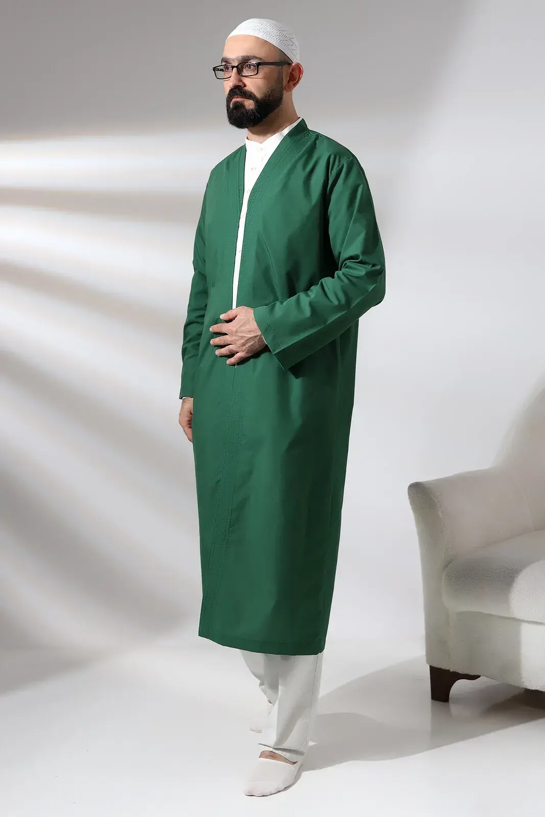 Bu namaz cübbesi, rahat kesimi ve düğmesiz önü açık tasarımıyla kullanıcıya hareket özgürlüğü sağlar, bu da ibadet sırasında rahatlıkla giyilmesini sağlar. Hem gündelik kullanıma hem de özel ibadet anlarına uygun bir kıyafettir.