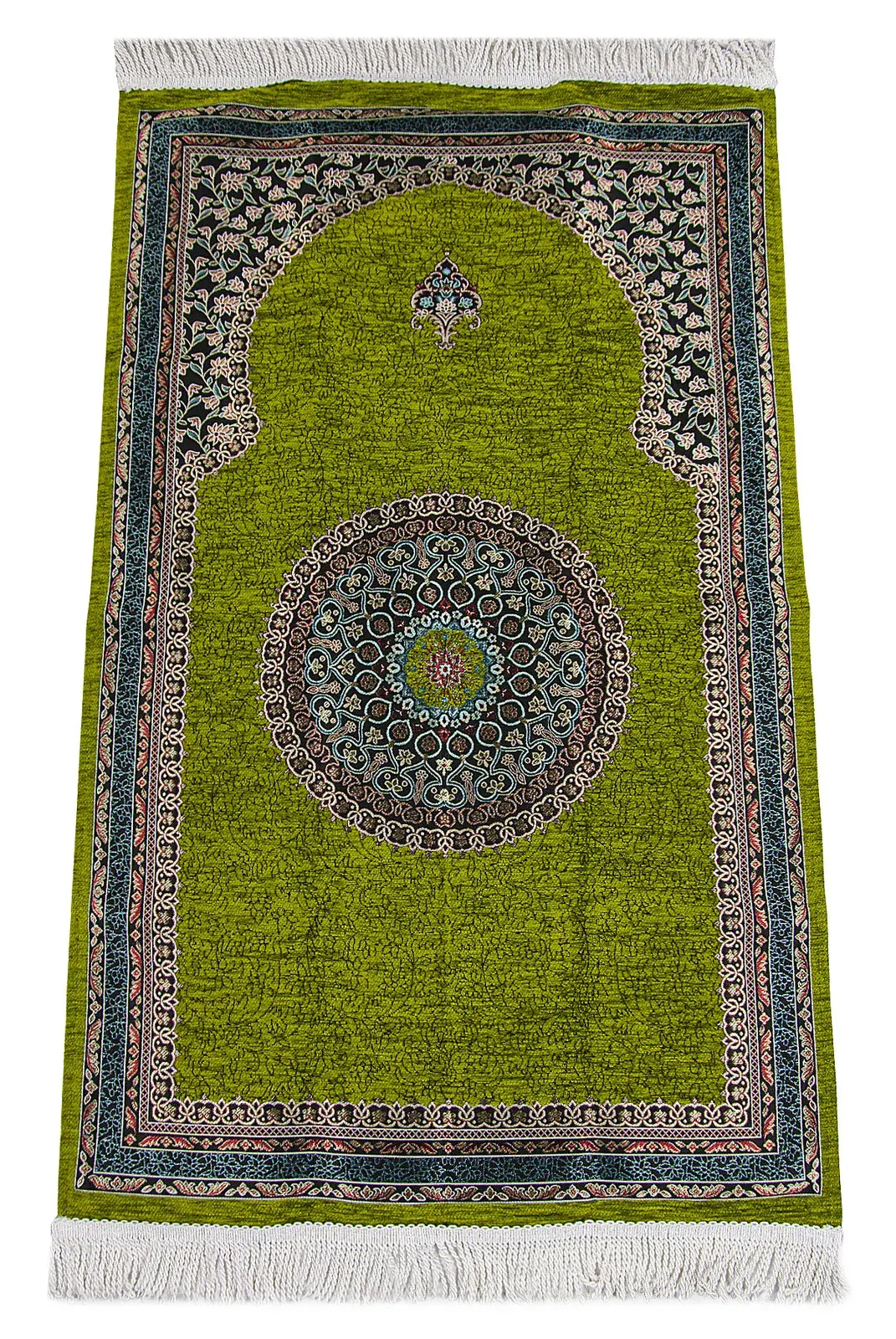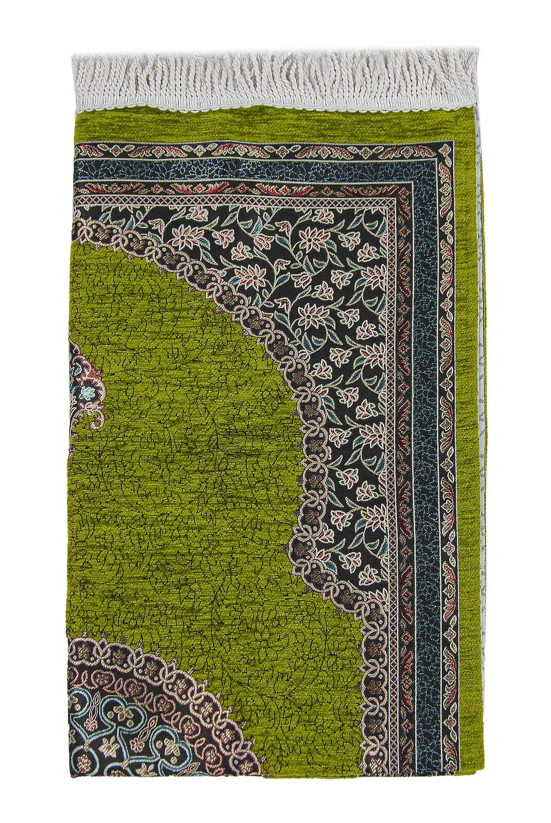 Yeşil Geleneksel Motifli Örgü Saçaklı Mihraplı Astarlı Şönil Seccade