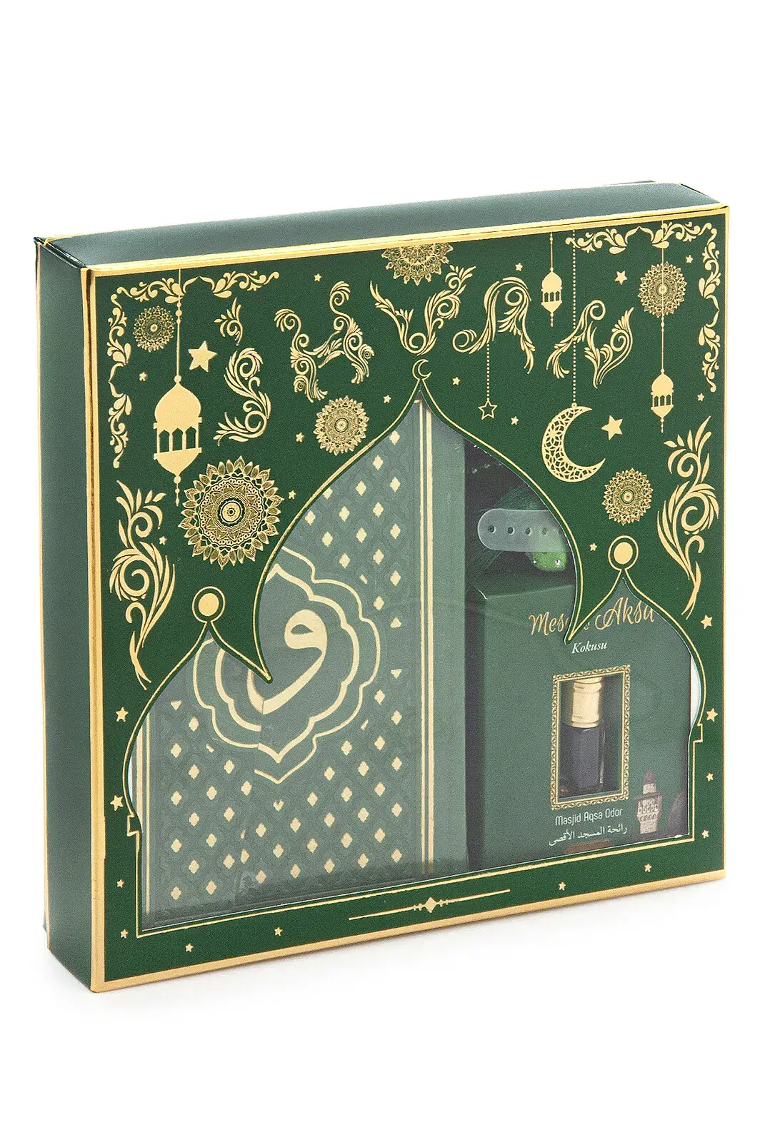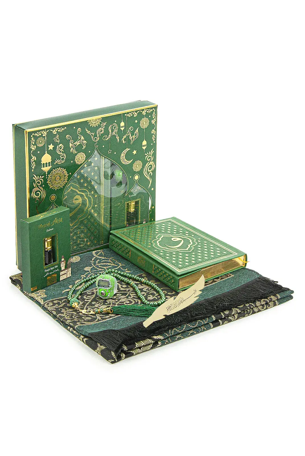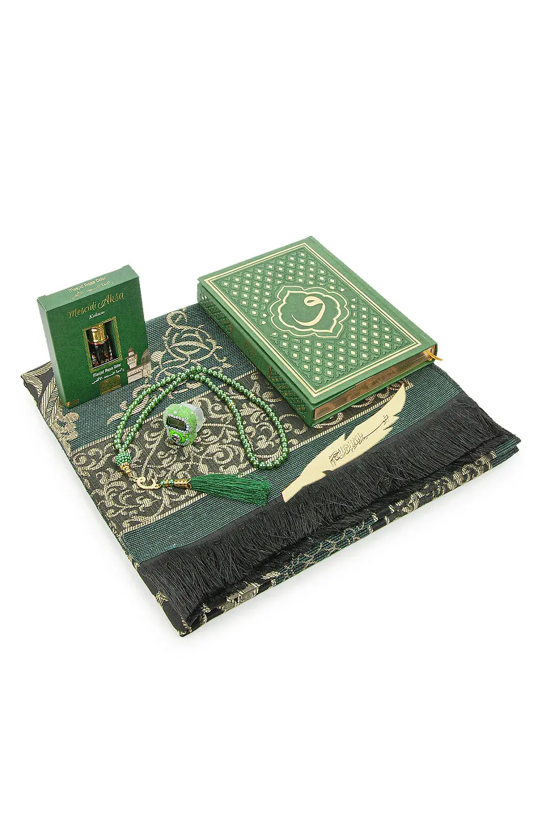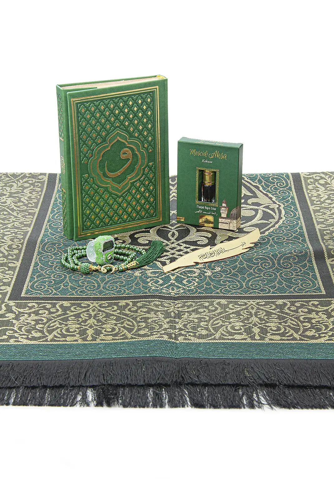Yeşil Vav Desenli Termo Deri Arapça Kuranı Kerim ve Seccade Seti