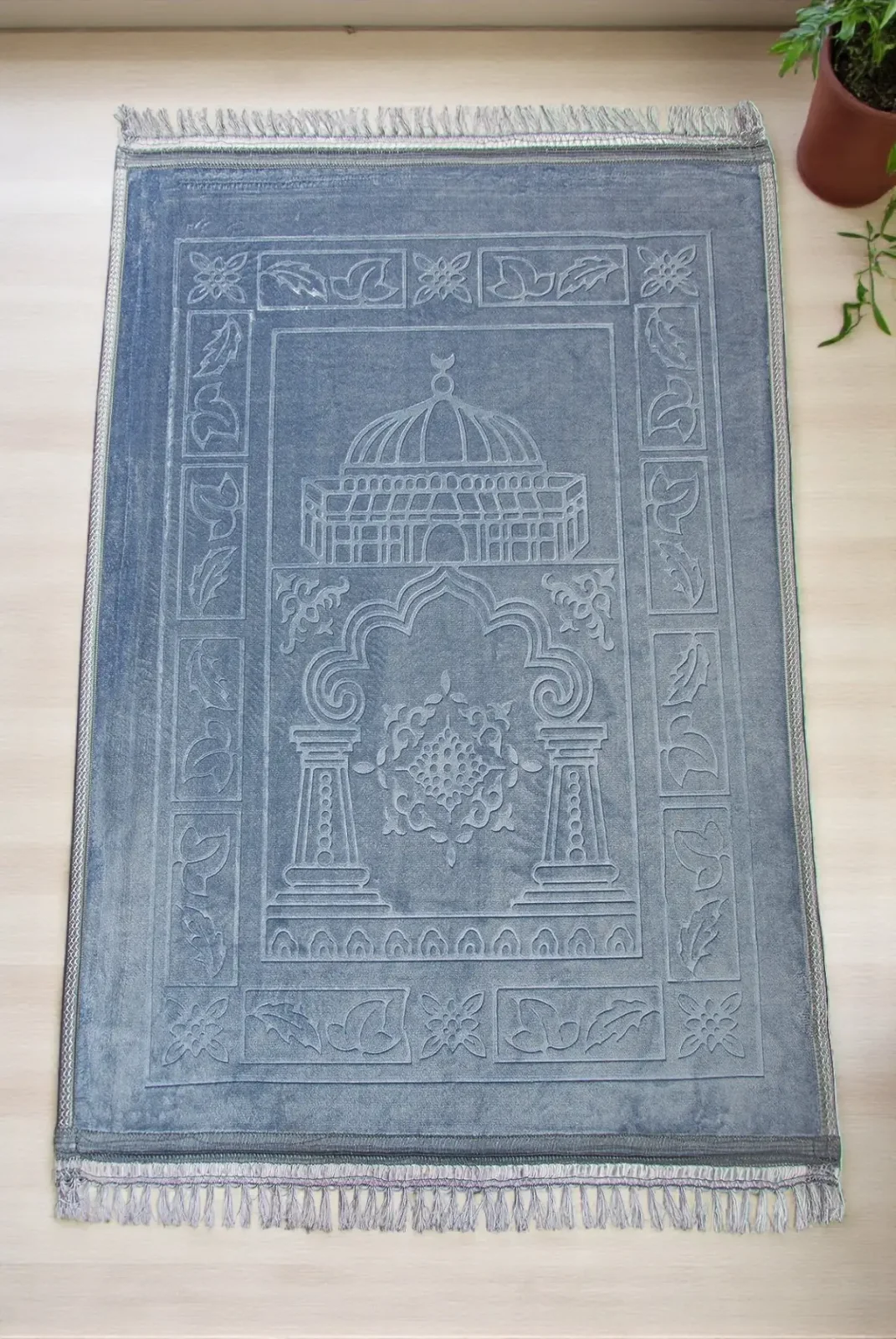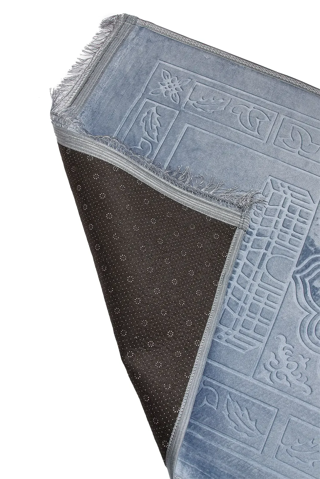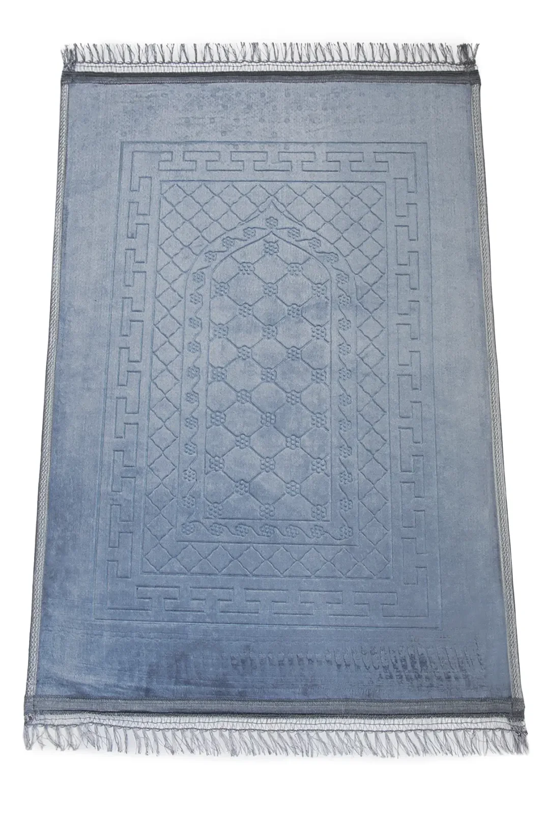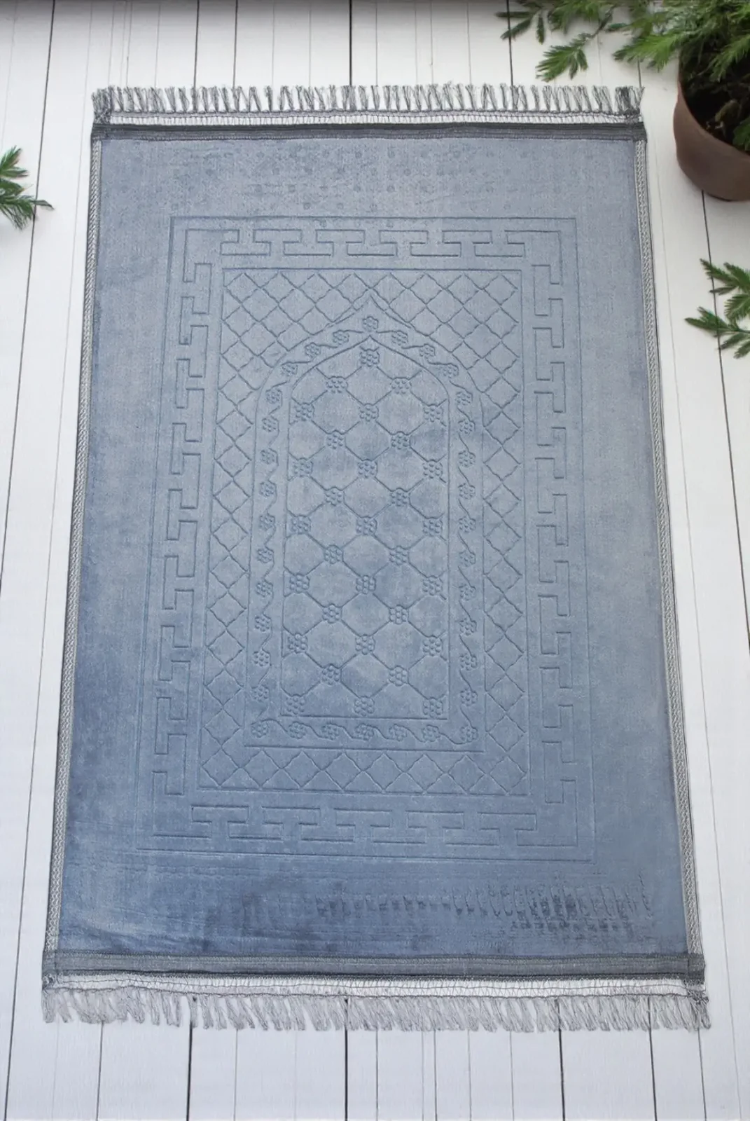 Serin tonlarıyla huzur veren mavi peluş seccade, kadife dokusuyla konforlu ve yumuşak bir ibadet ortamı oluşturur. Cami motifleriyle klasik zarafeti bir araya getirir.