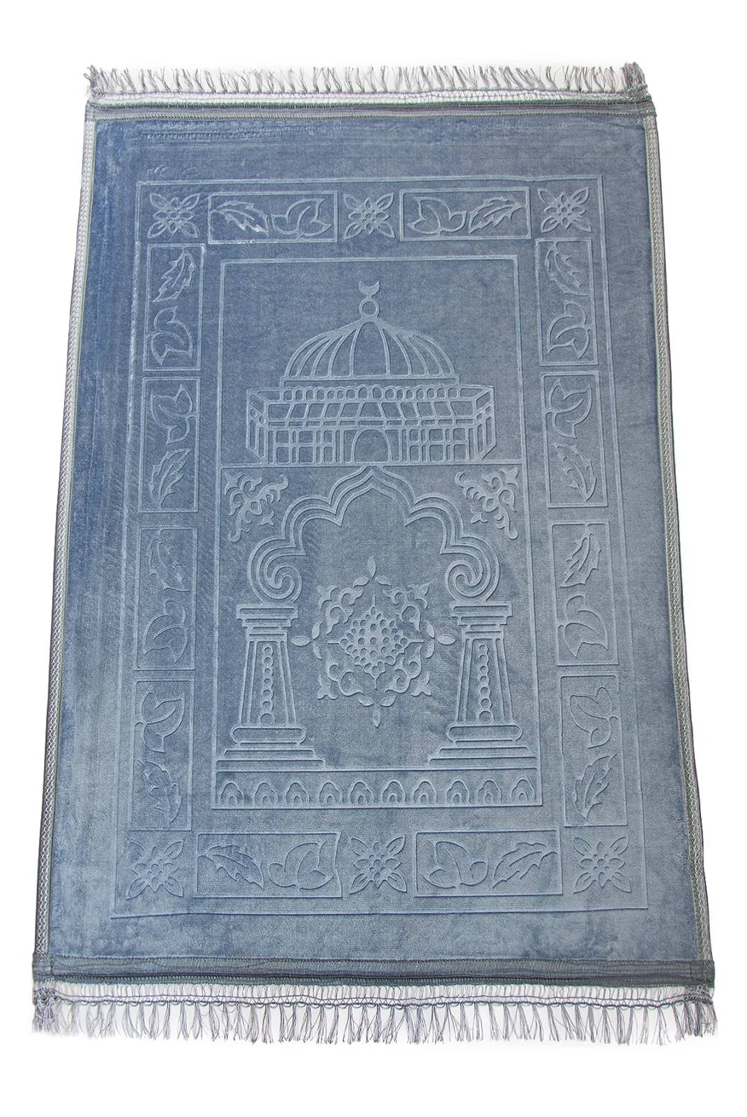 Serin tonlarıyla huzur veren mavi peluş seccade, kadife dokusuyla konforlu ve yumuşak bir ibadet ortamı oluşturur. Cami motifleriyle klasik zarafeti bir araya getirir.